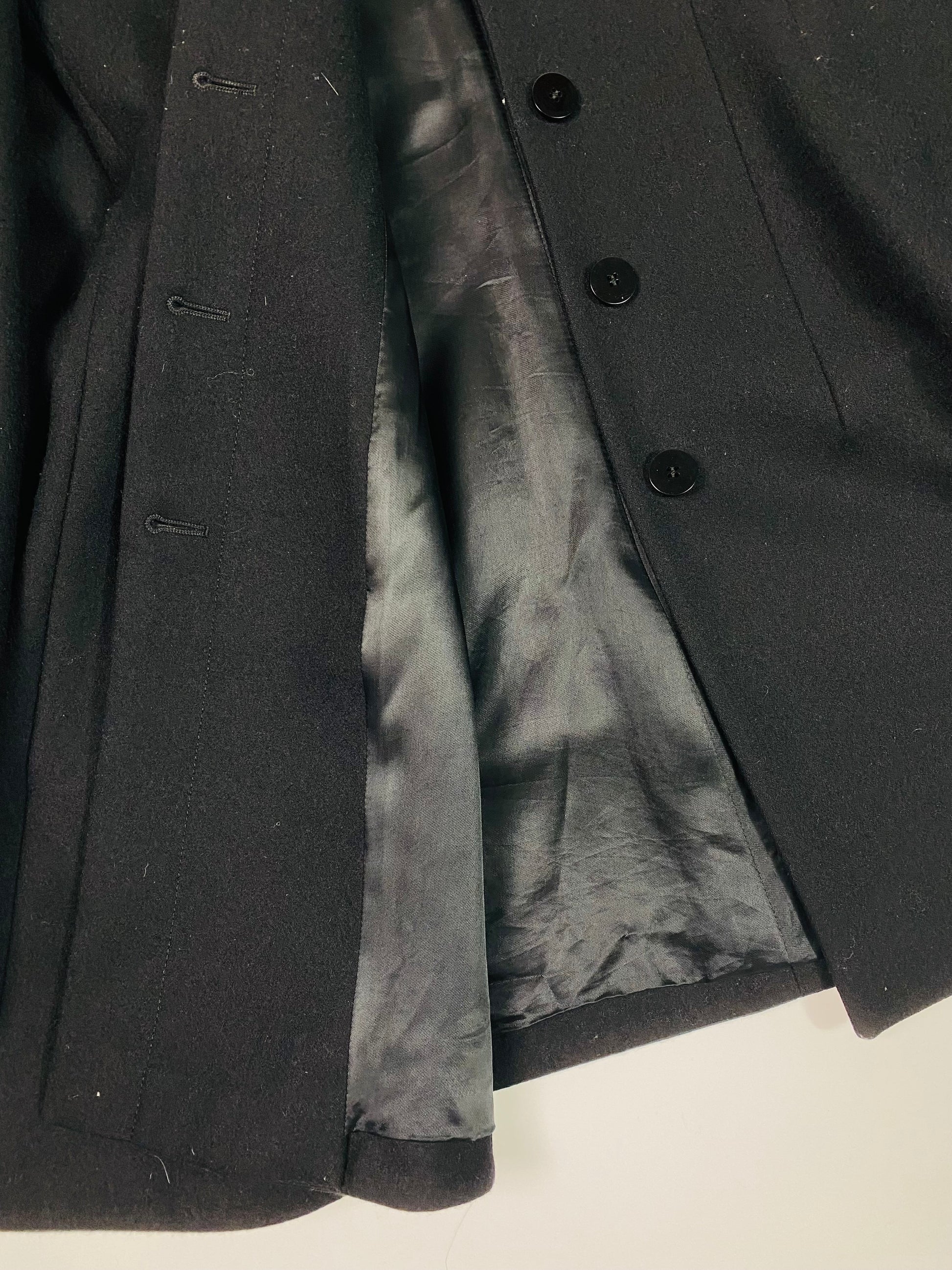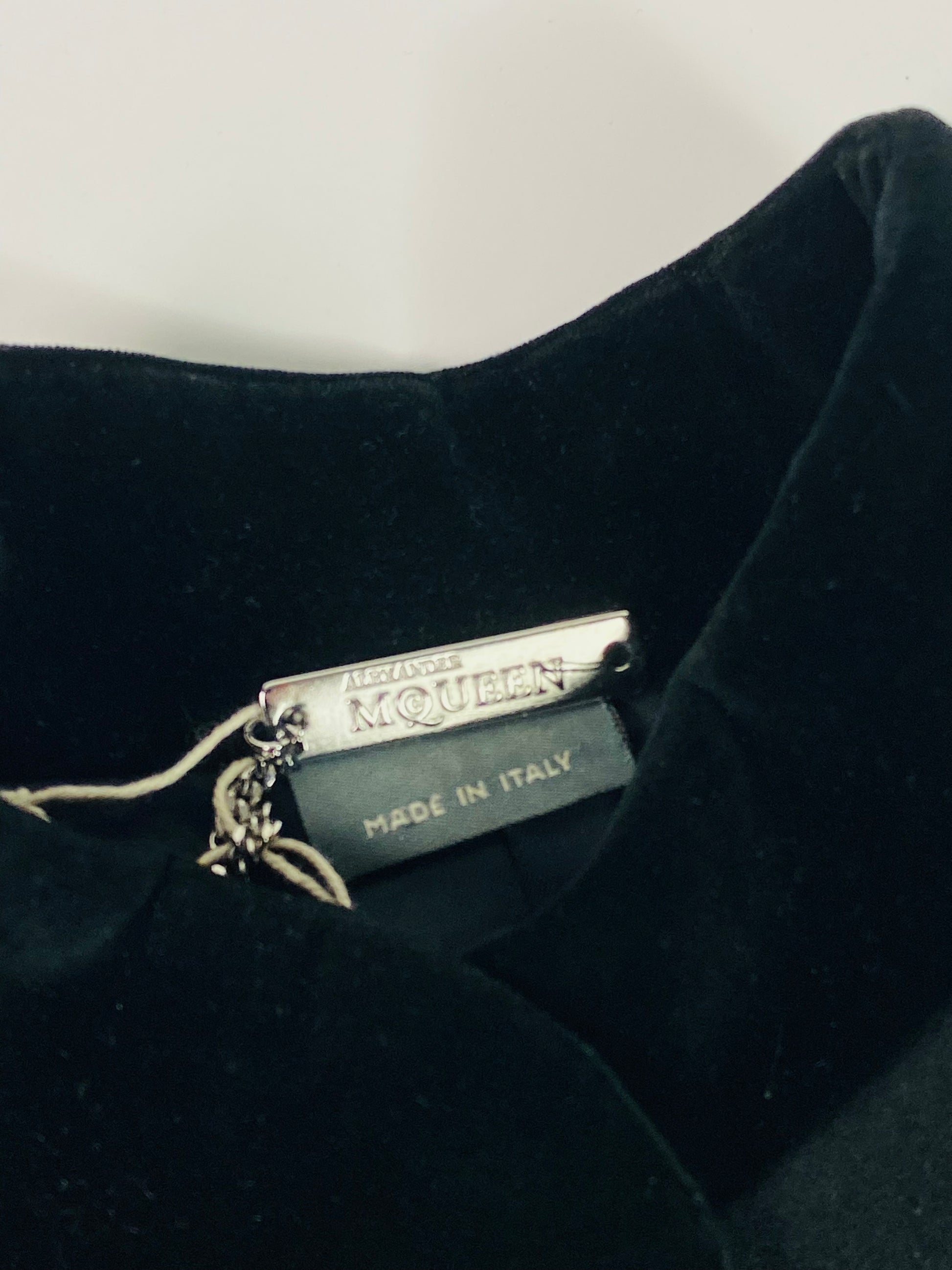 Amazing black cape jacket by McQueen with a velvet band collar at the neckline and beautiful tailoring at the waist to flatter the figure elegantly alongside the dramatic cape feature. This jacket has a satin finish lining and hidden black buttons down the front of the interior.