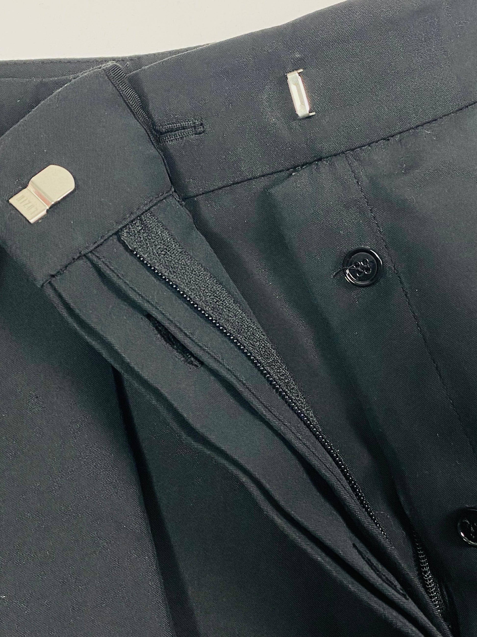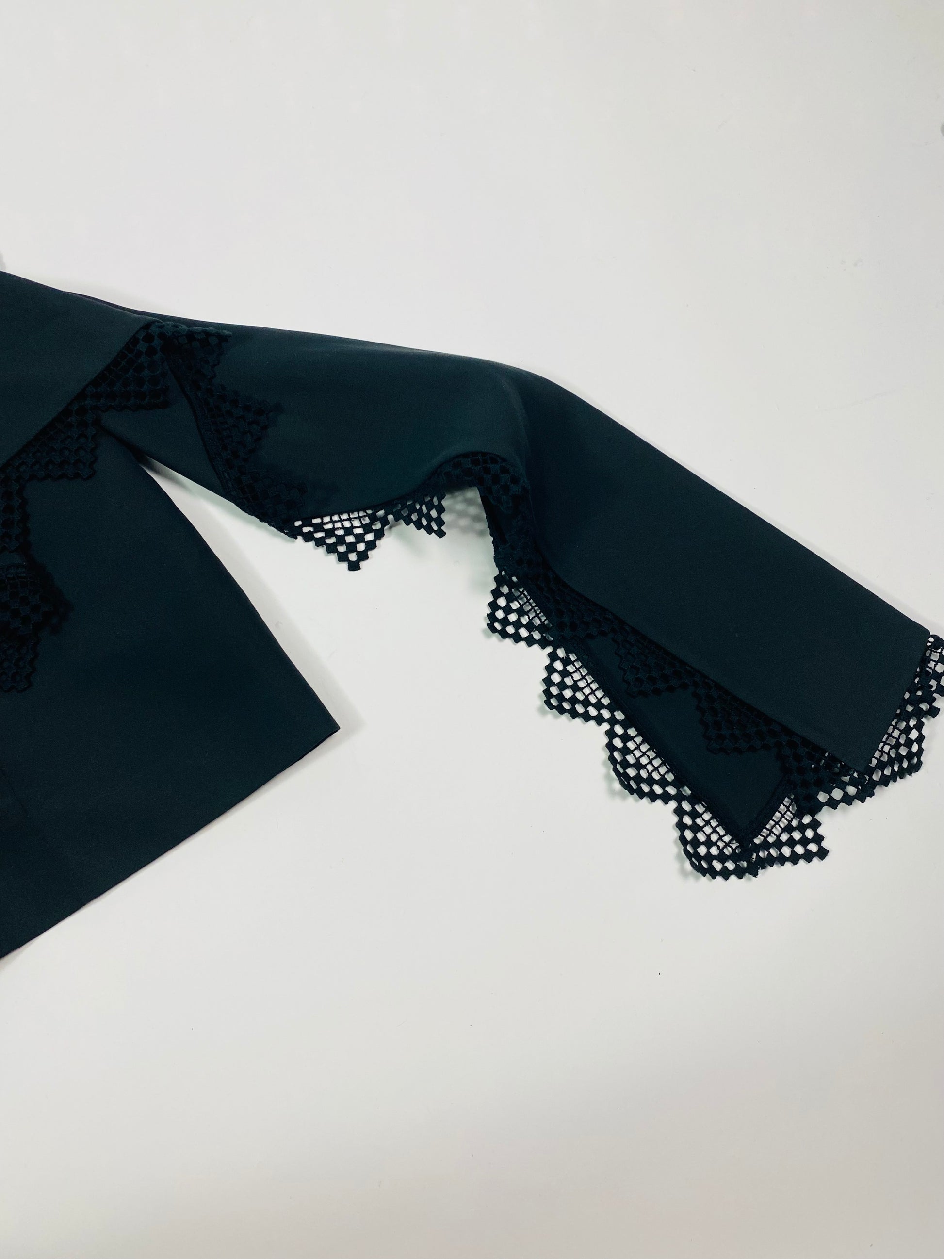 Elevated, black tailored 'suit' shorts with fabulous, lace-trimmed ruffles extending from the waistband. Features a button, clasp and zip closure at the waistband and the shorts flare out slightly for a flattering fit.