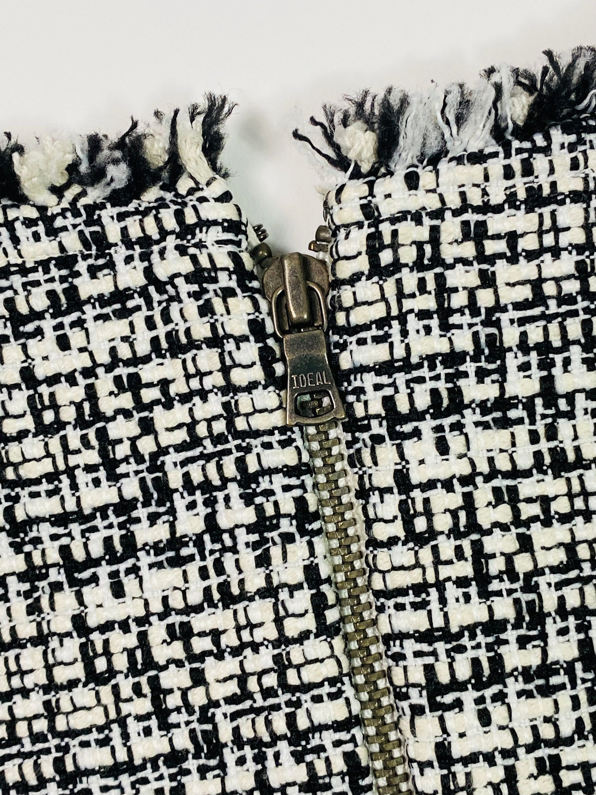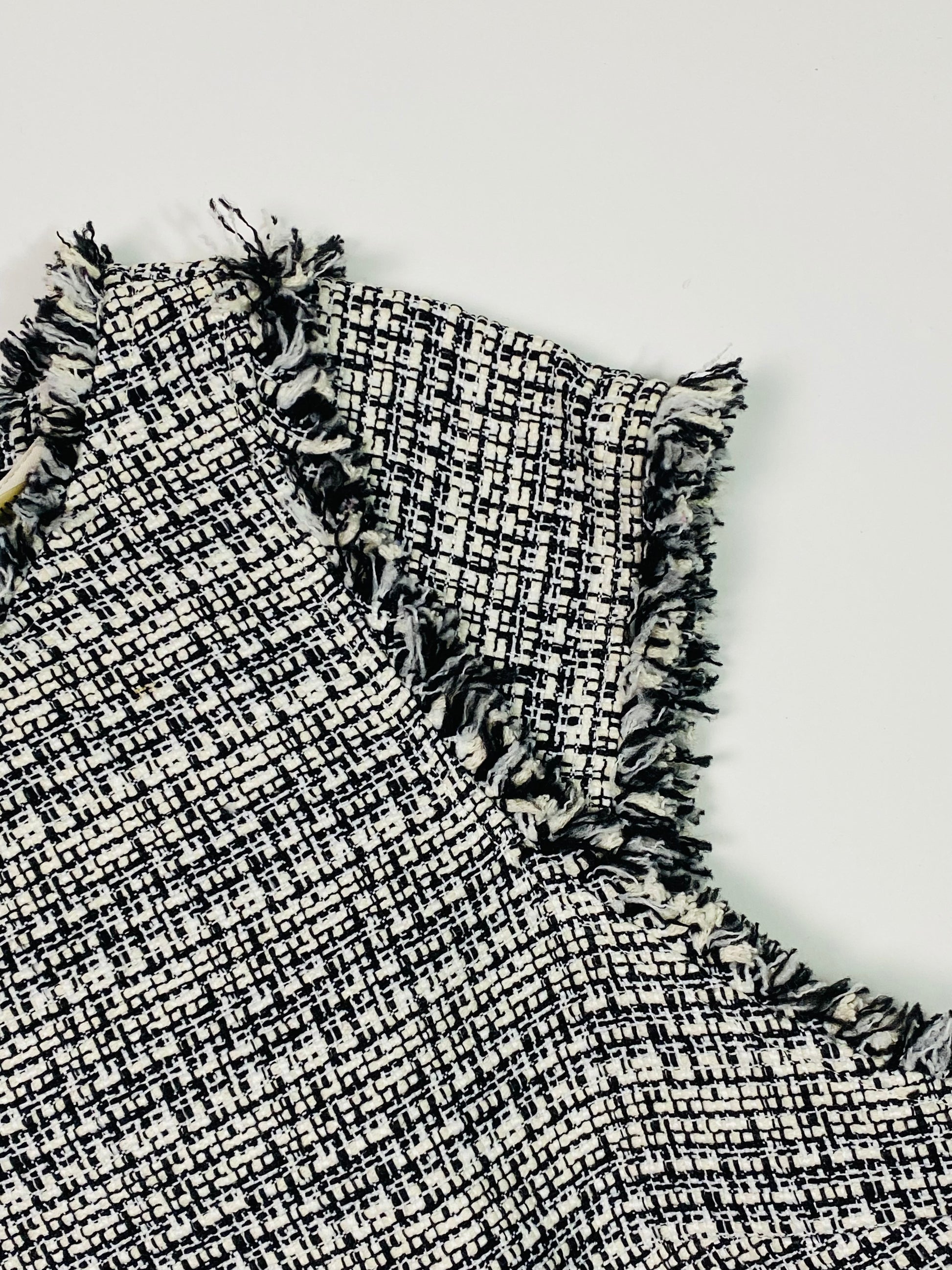Cute black and white tweed short top featuring cap sleeves, tailored seam detailing and a flattering round (almost) boat neckline. Has a zip closure at the back of the top.