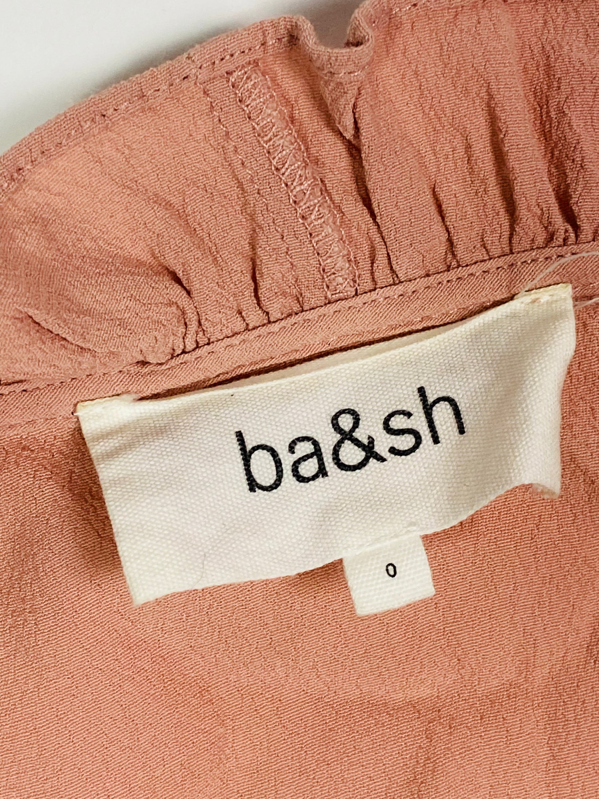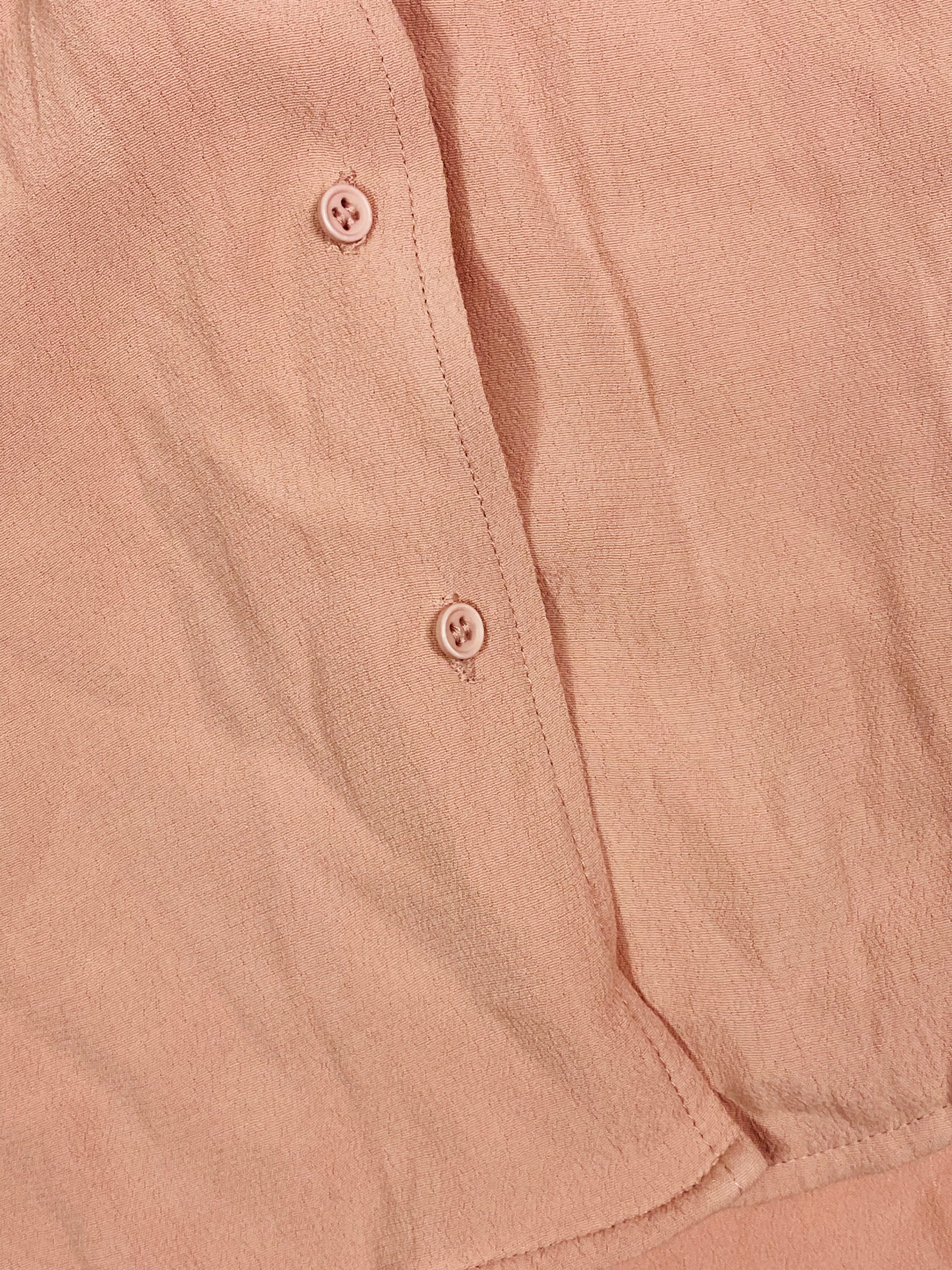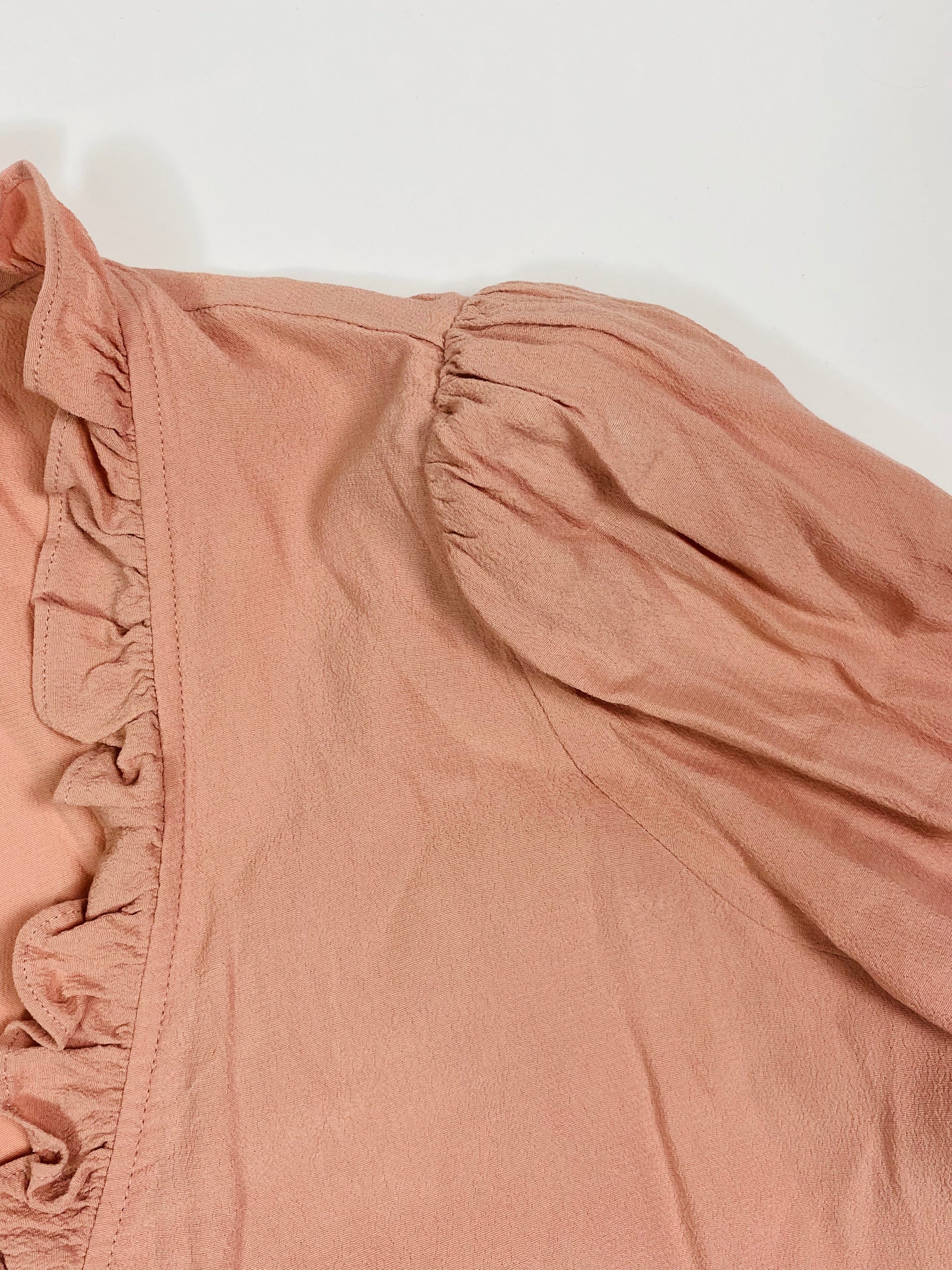 Gorgeous lightweight blouse in a salmon pink with a soft linen feel to it. Features a ruffled neckline and sleeve cuffs, padded ruched shoulders, and pretty pink buttons down the front.