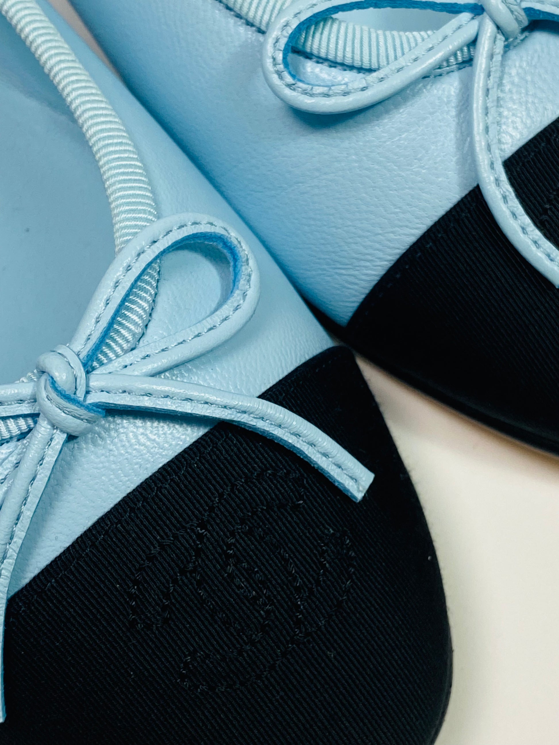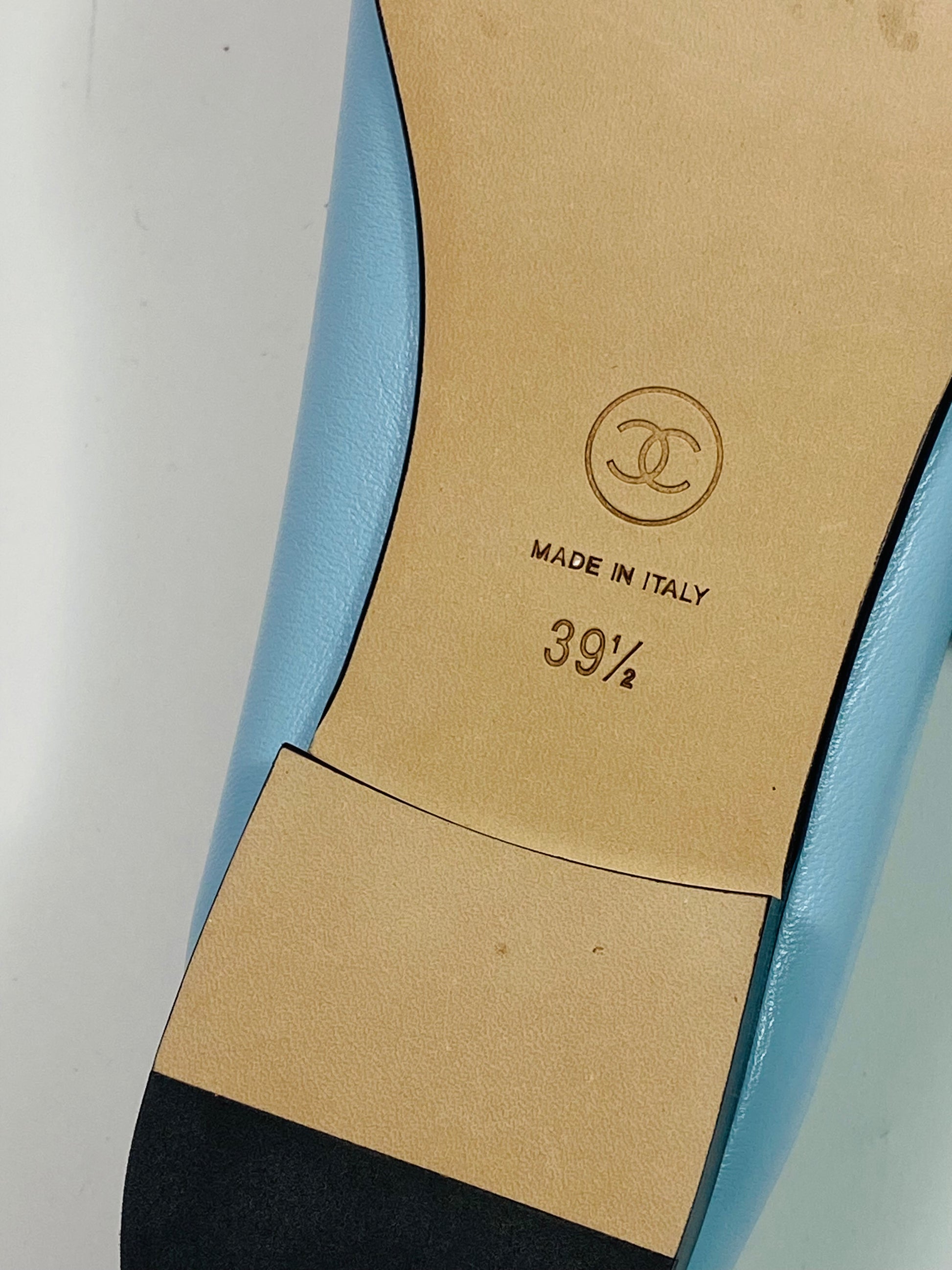 Stunning baby blue leather ballet flats with the iconic 'CC' logo embroidered onto the classic black cap toe design. Features decorative leather ribbon bows at the top of the pumps also.