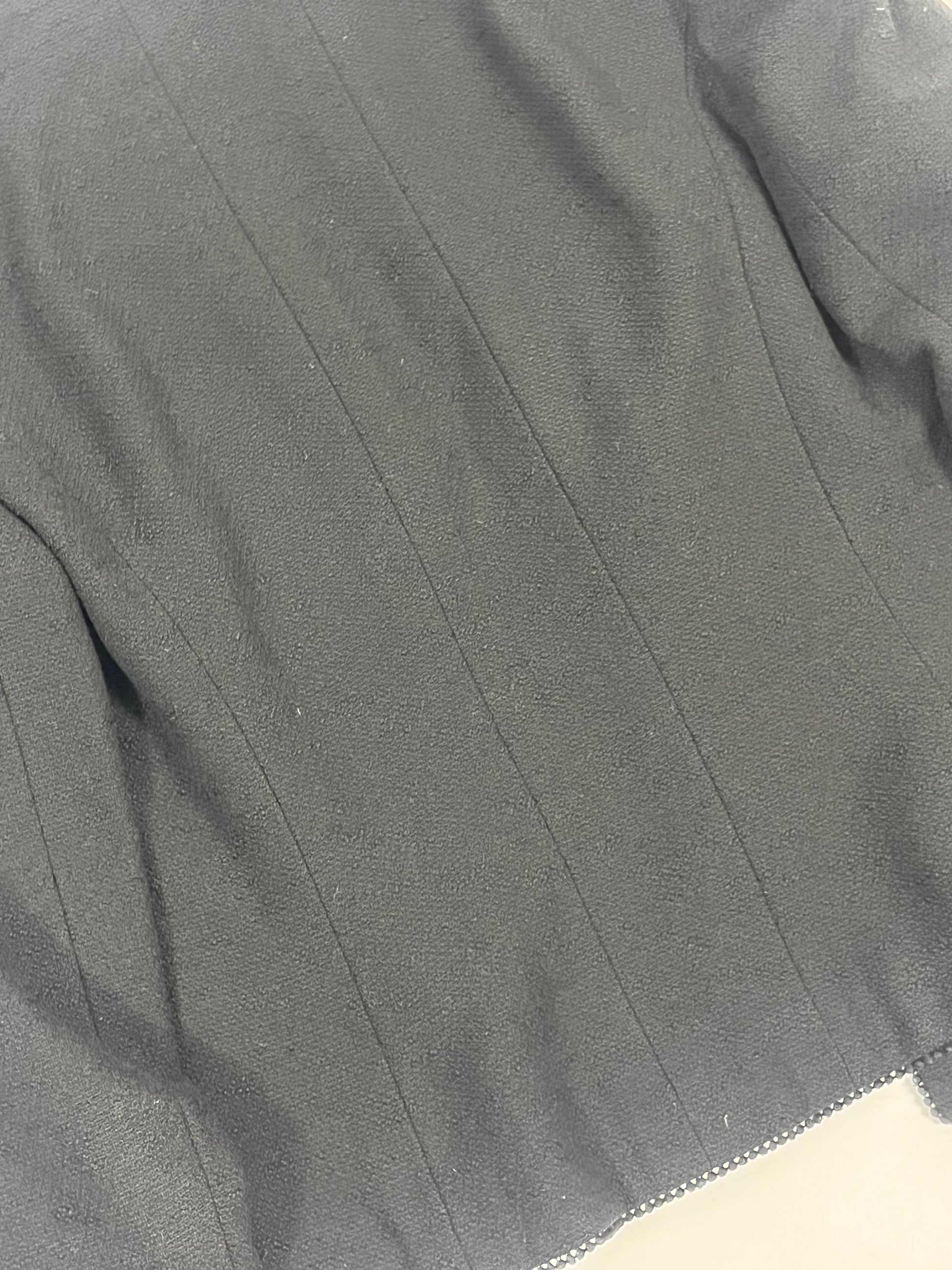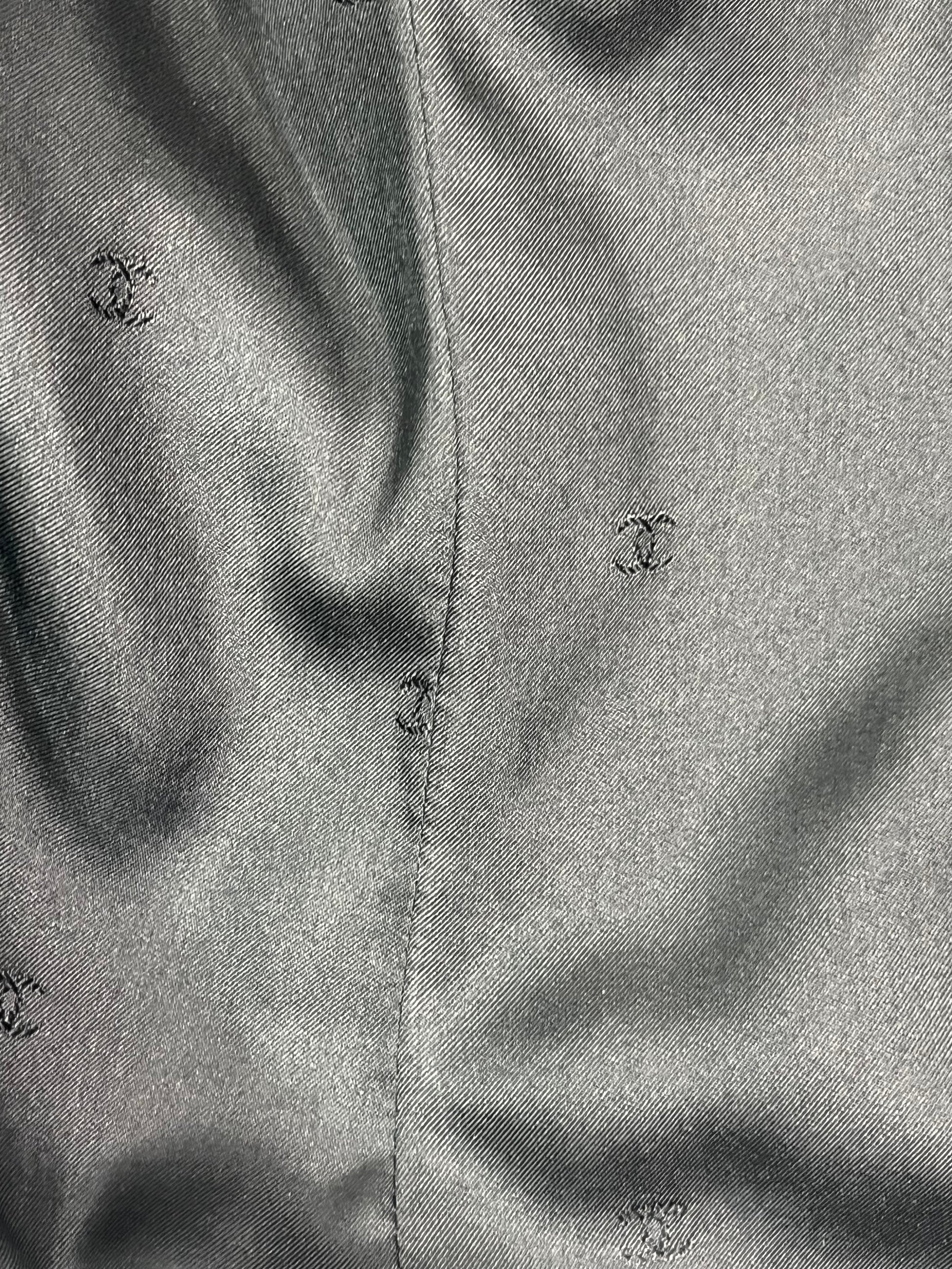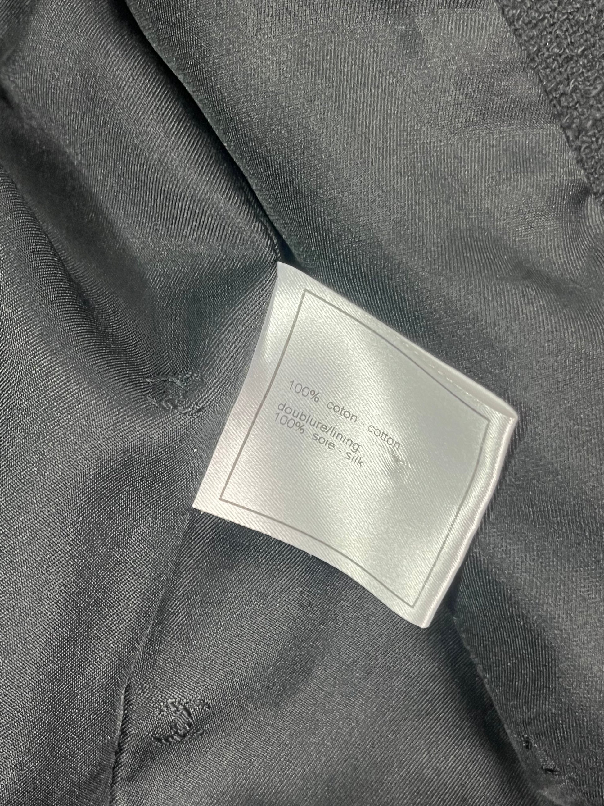 A real gem , black cotton woven to resemble tweed . An edge to edge jacket with two pockets and a matching skirt in excellent condition , lined in black silk embossed with CCs the jacket is weighted by a silver chain and finished with silver logo buttons on the cuffs