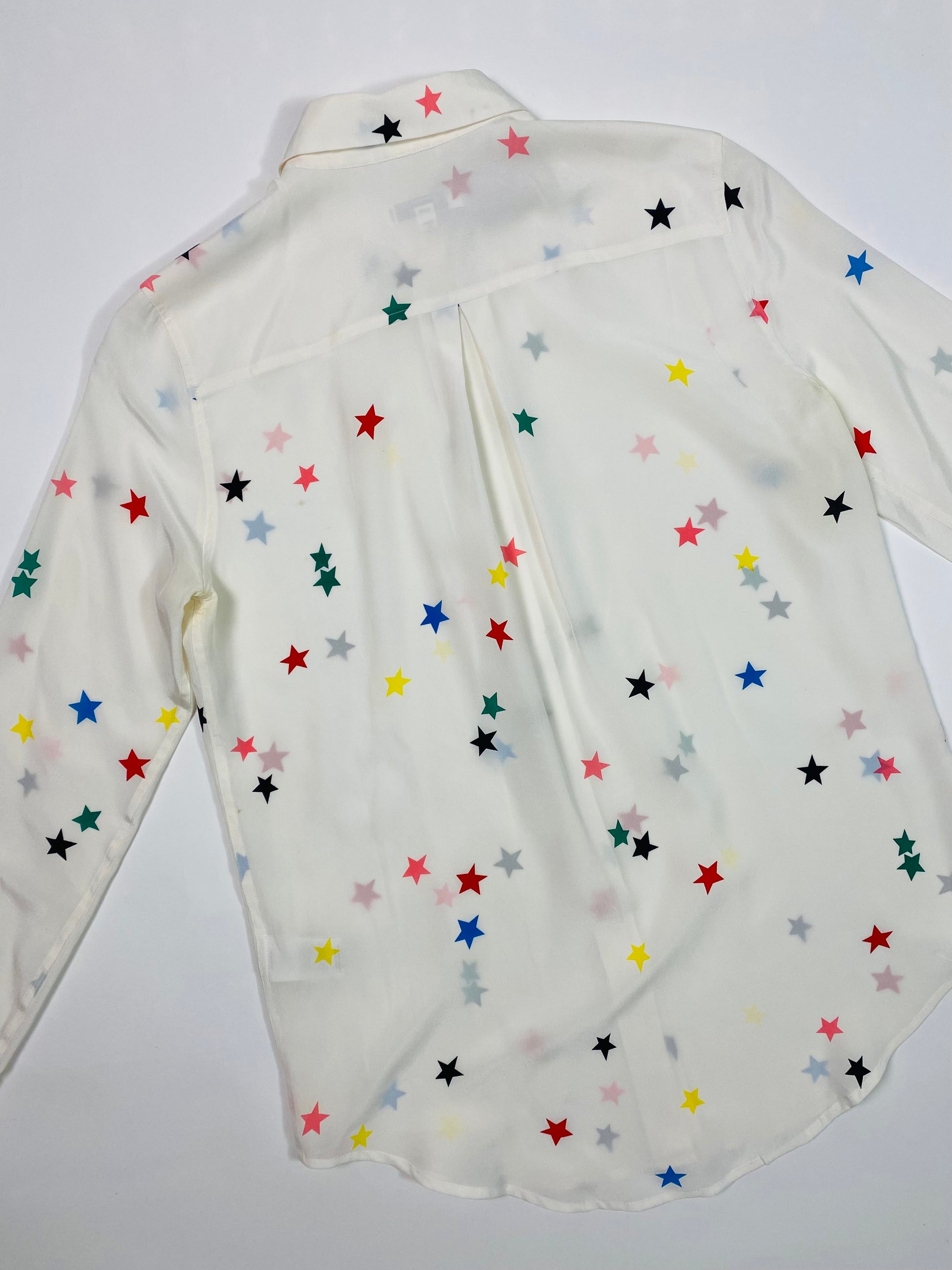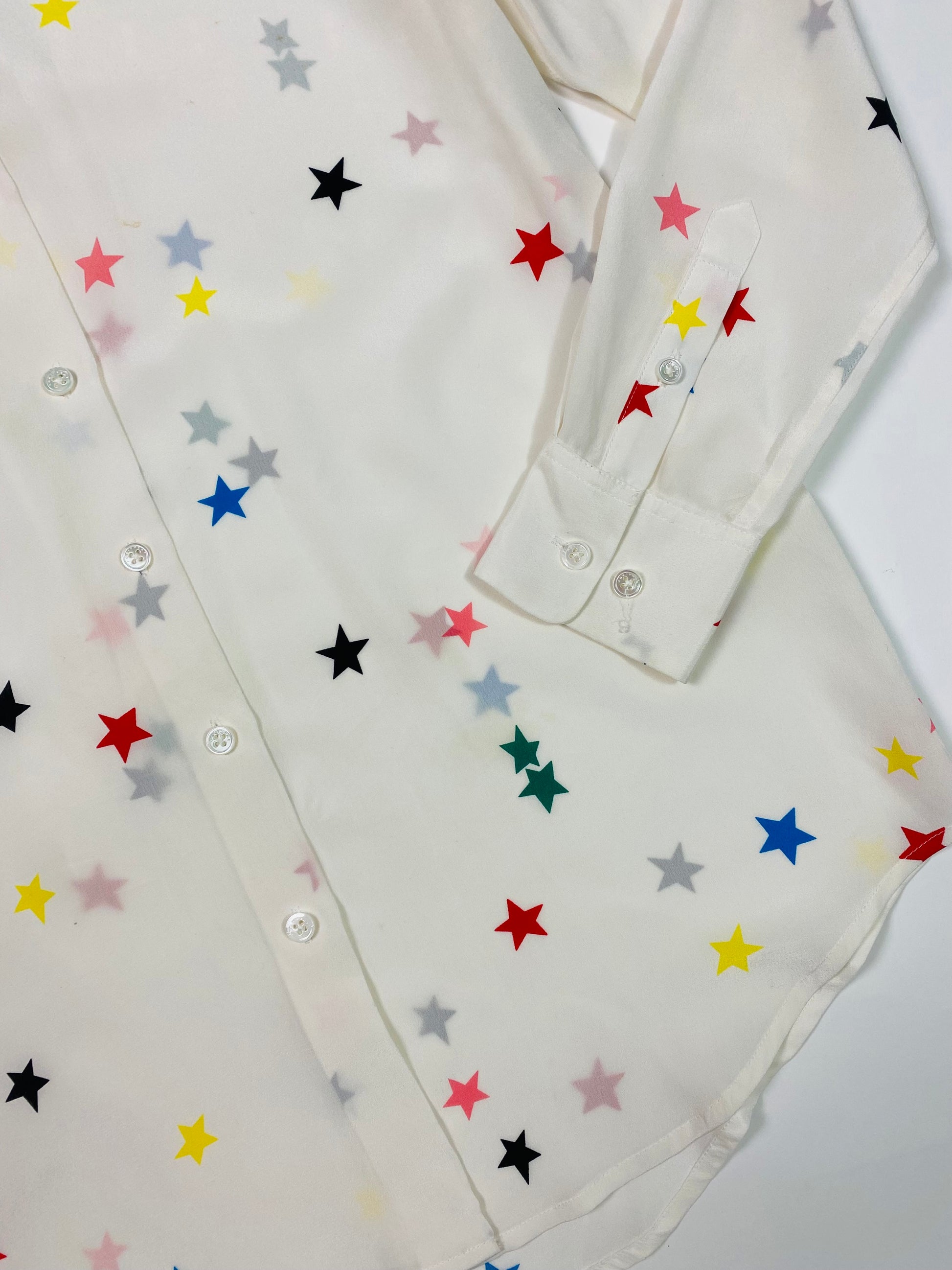 Creamy white 100% silk shirt with a playful multi-coloured star print all over and pearly white buttons lining the front and sleeve cuffs. Features nice pleating details on the back of the shirt for a cleaner fit.