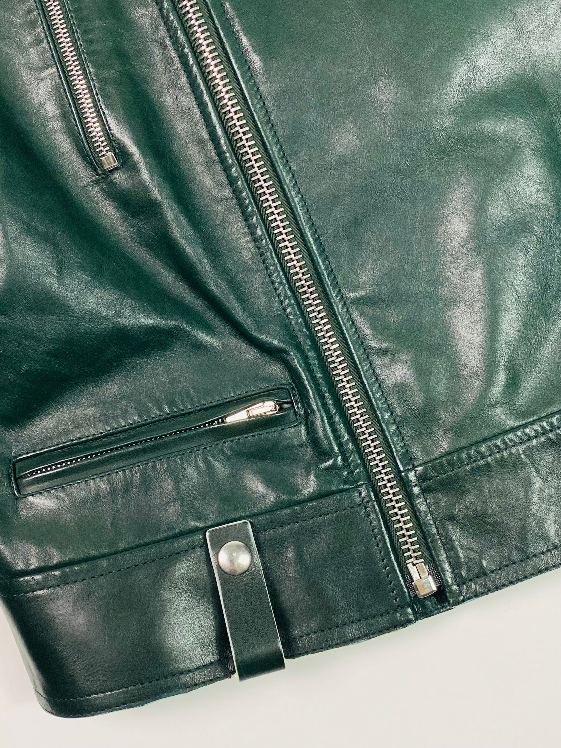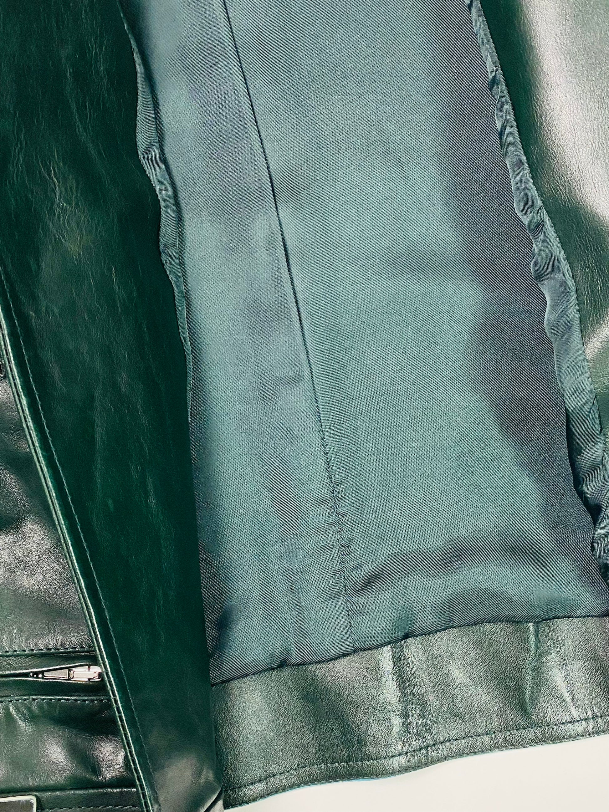Deep green leather jacket with excessive metal hardware detailing and zips throughout the exterior, and a silky green lining on the interior. Has a cool sort of oversized bulky fit and a vintage look about it.