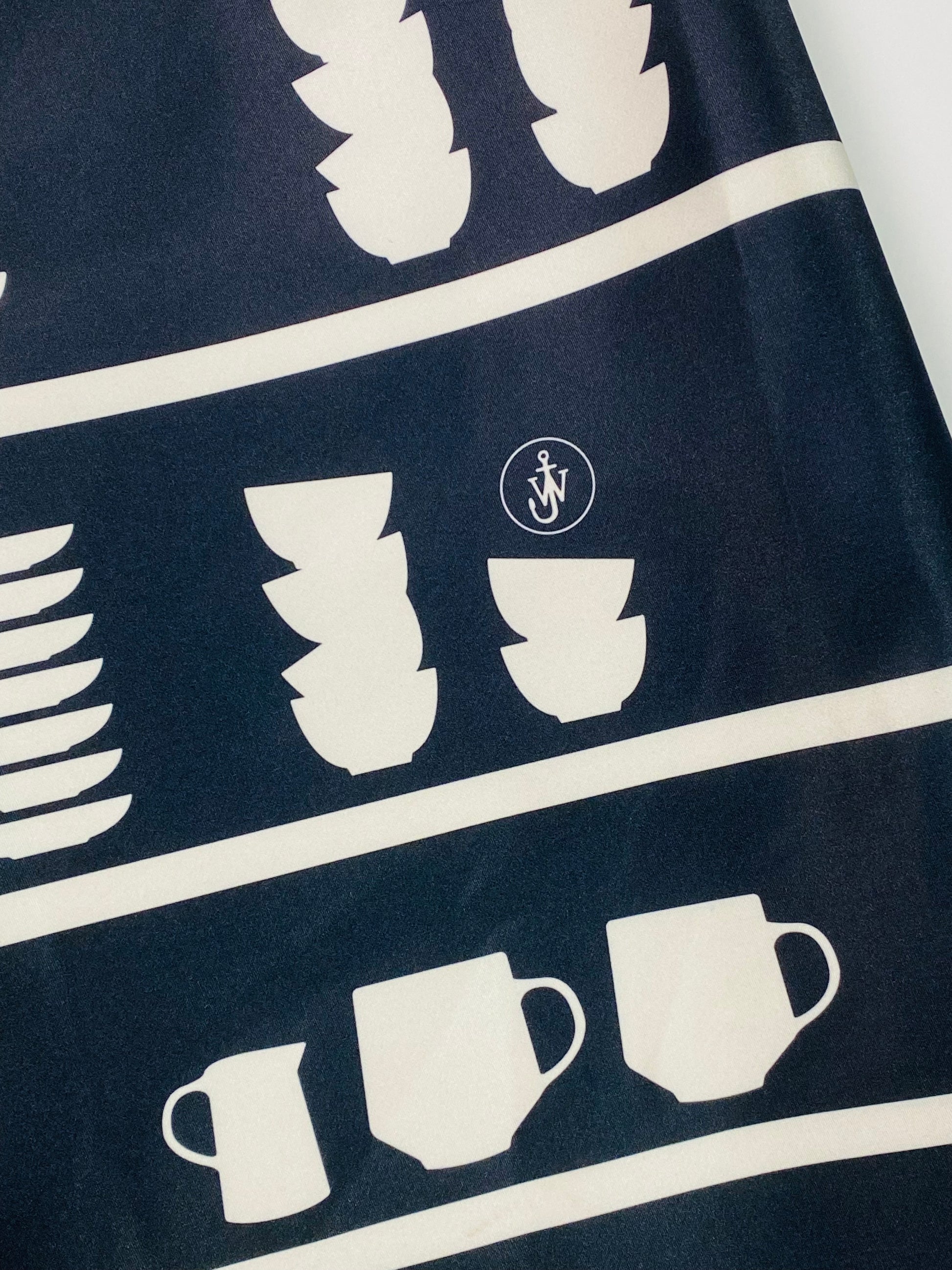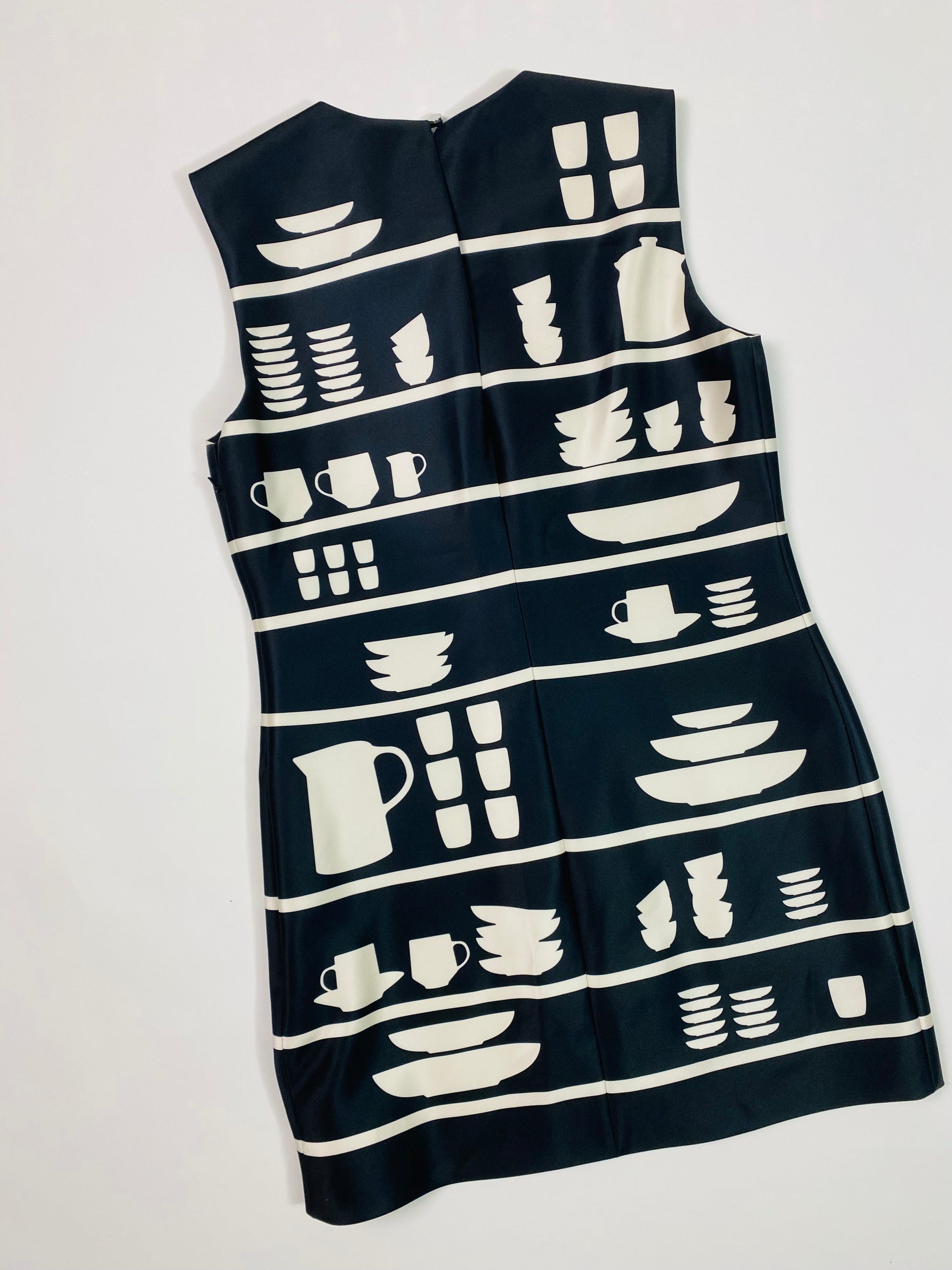Classy little black dress from this seasons collection, featuring a playful crockery graphic print all over. Has a simple yet elegant round neckline, a short length, and a beautiful satin finish on the double lined fabric.