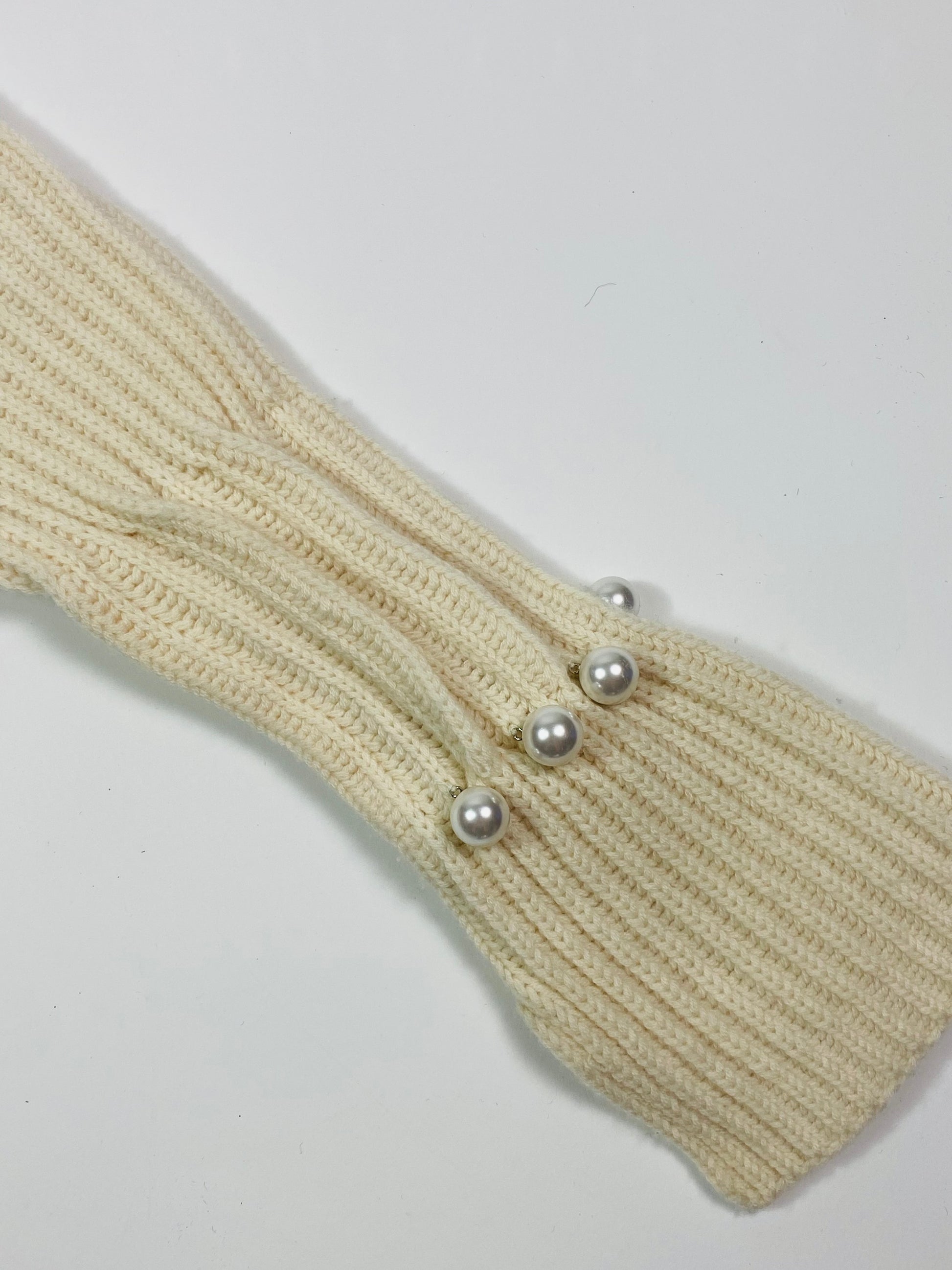 Gorgeous cream knit sweater featuring a high neck with pearl embellishments beneath and on the cinched sleeves. Loose fitting and sits at the waist with a slight crop. Made with super soft wool for ultimate comfort.