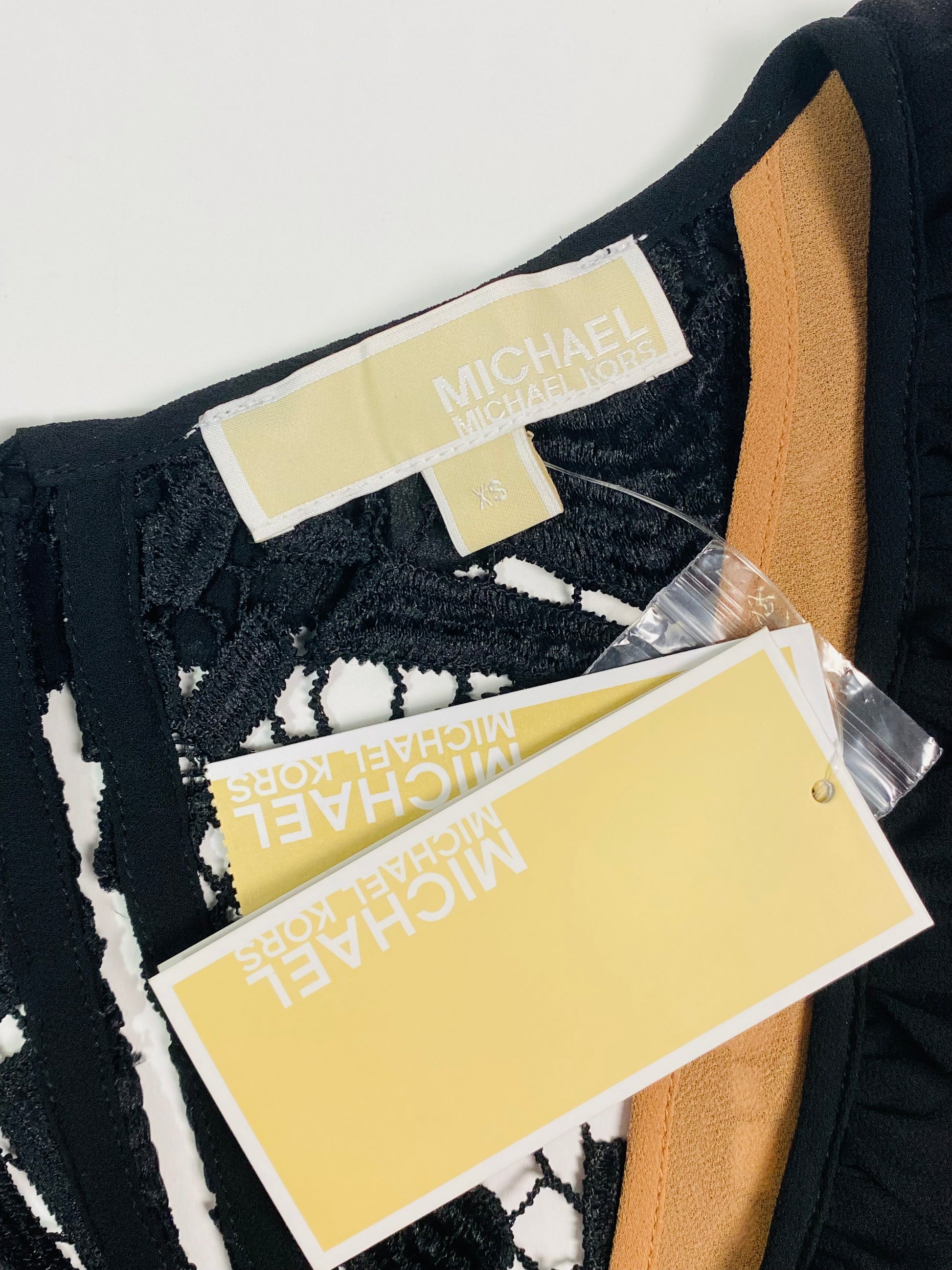 Gorgeous nude midi dress with a chic black lace overlay and a ruffled neckline and hem. Features a deep round neckline with the nude fabric peeking out the sides, and a sleeveless design. Has a keyhole cutout and button loop closure at the back of the dress.