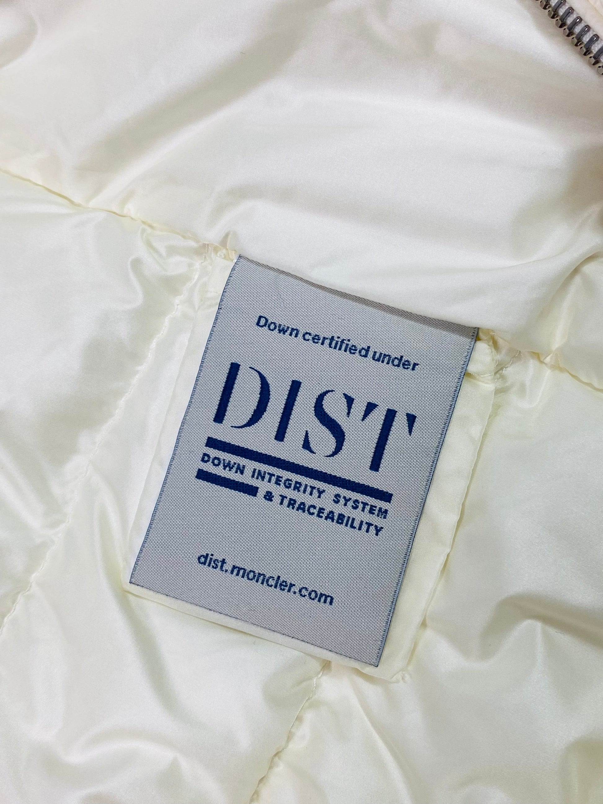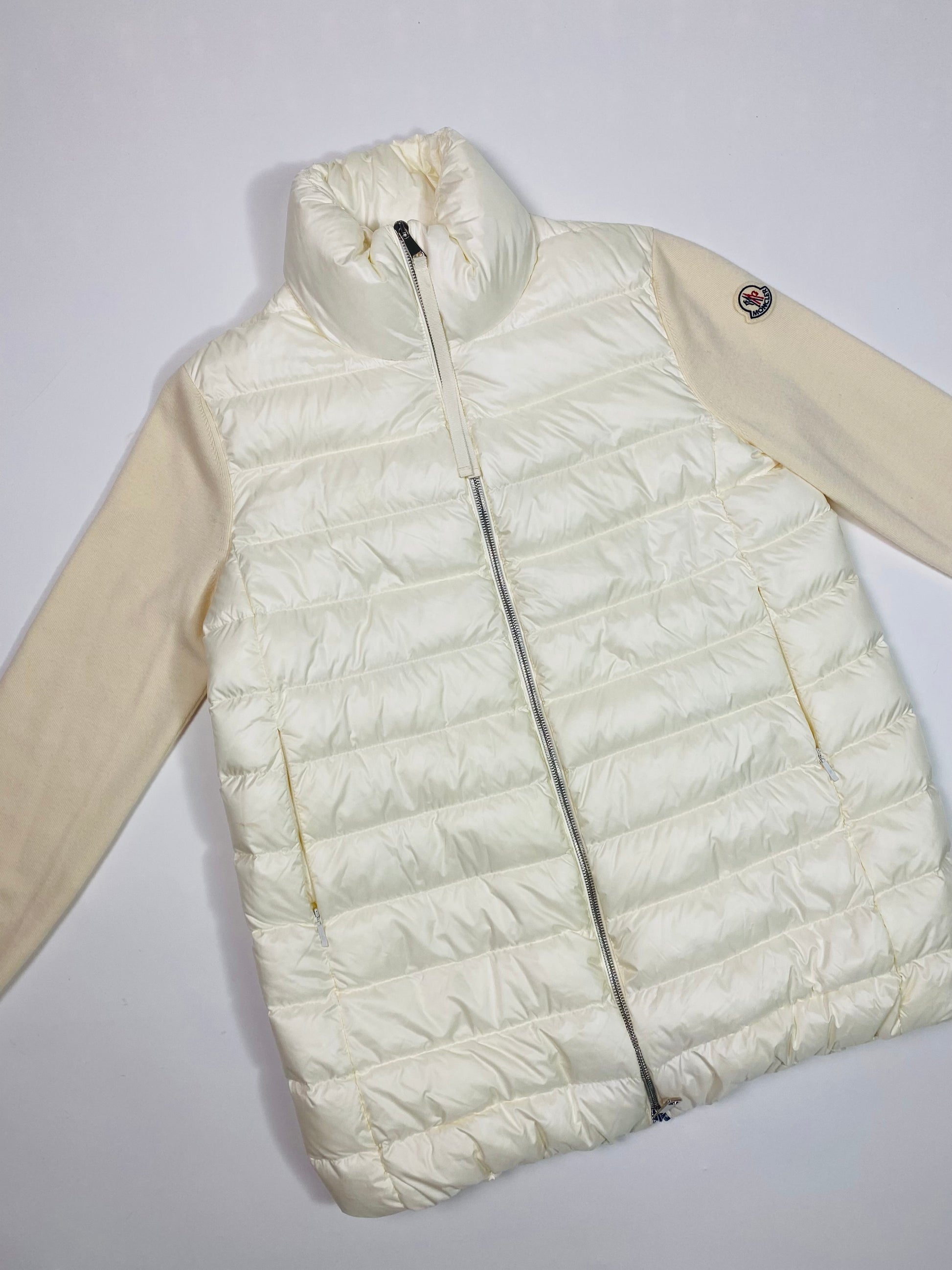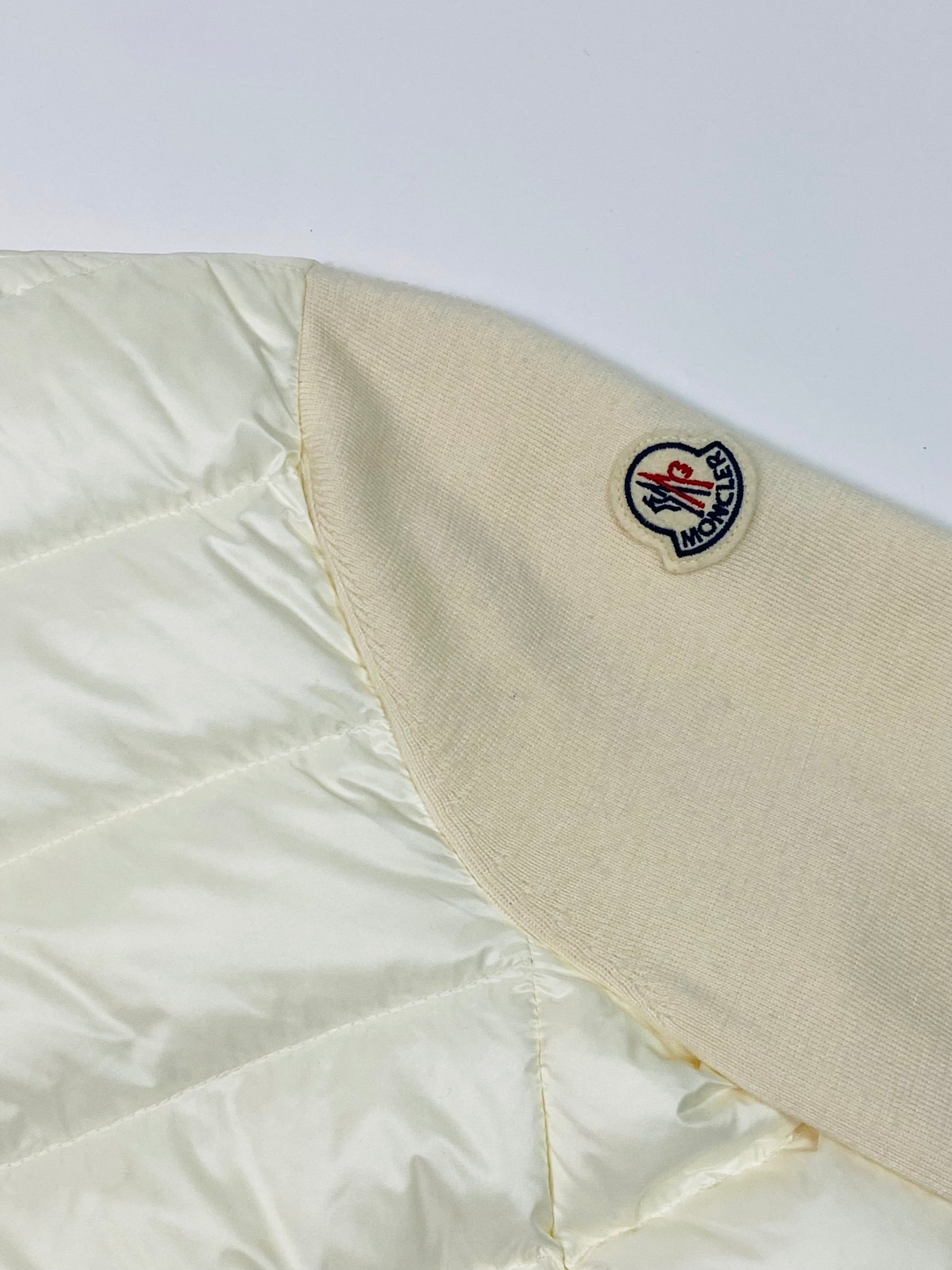 Cream lightweight puffer jacket in a gilet style with soft knit sleeves featuring the classic logo badge on the side. Silver hardware zips line the front of the jacket as well as two side pockets.