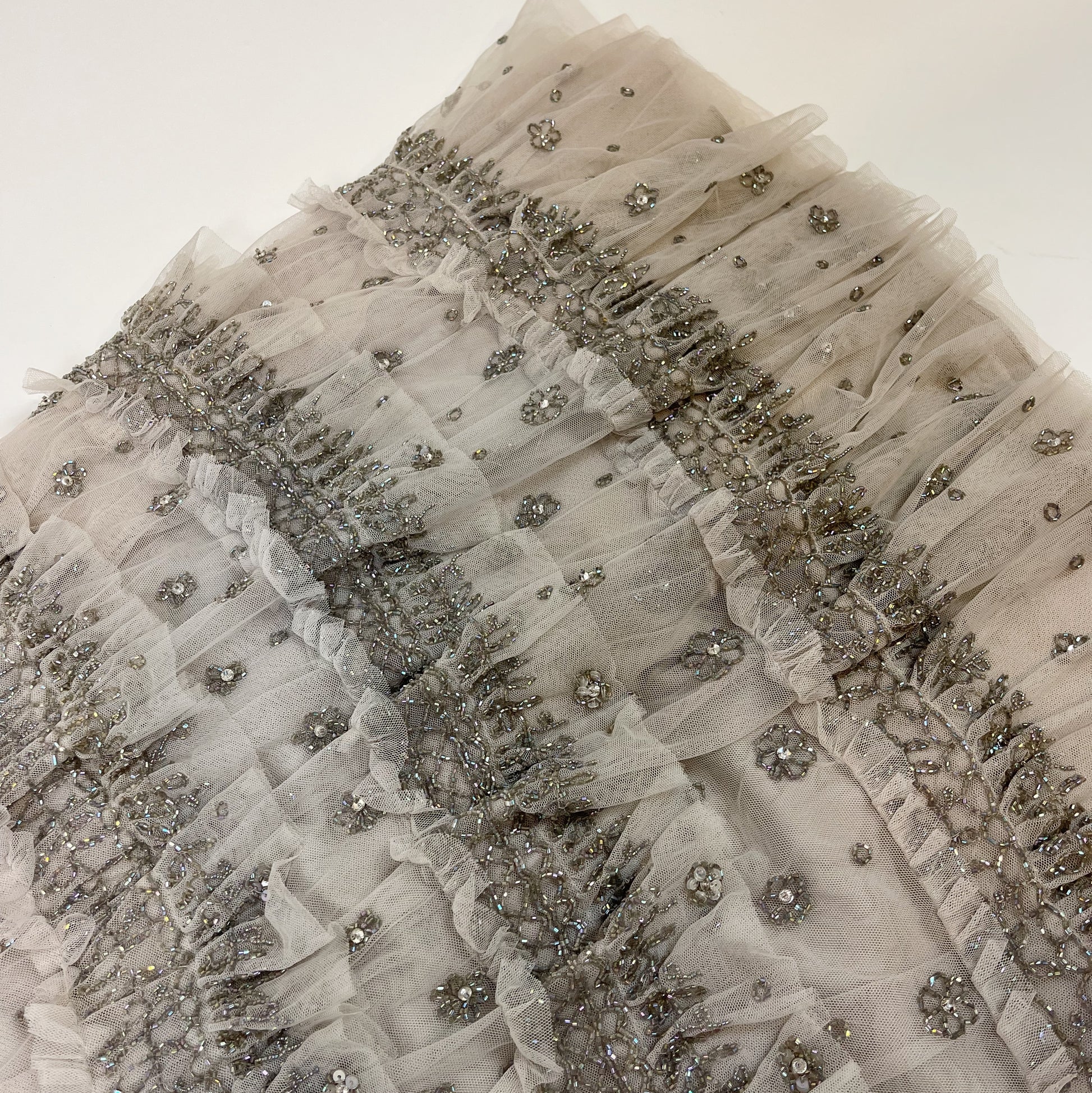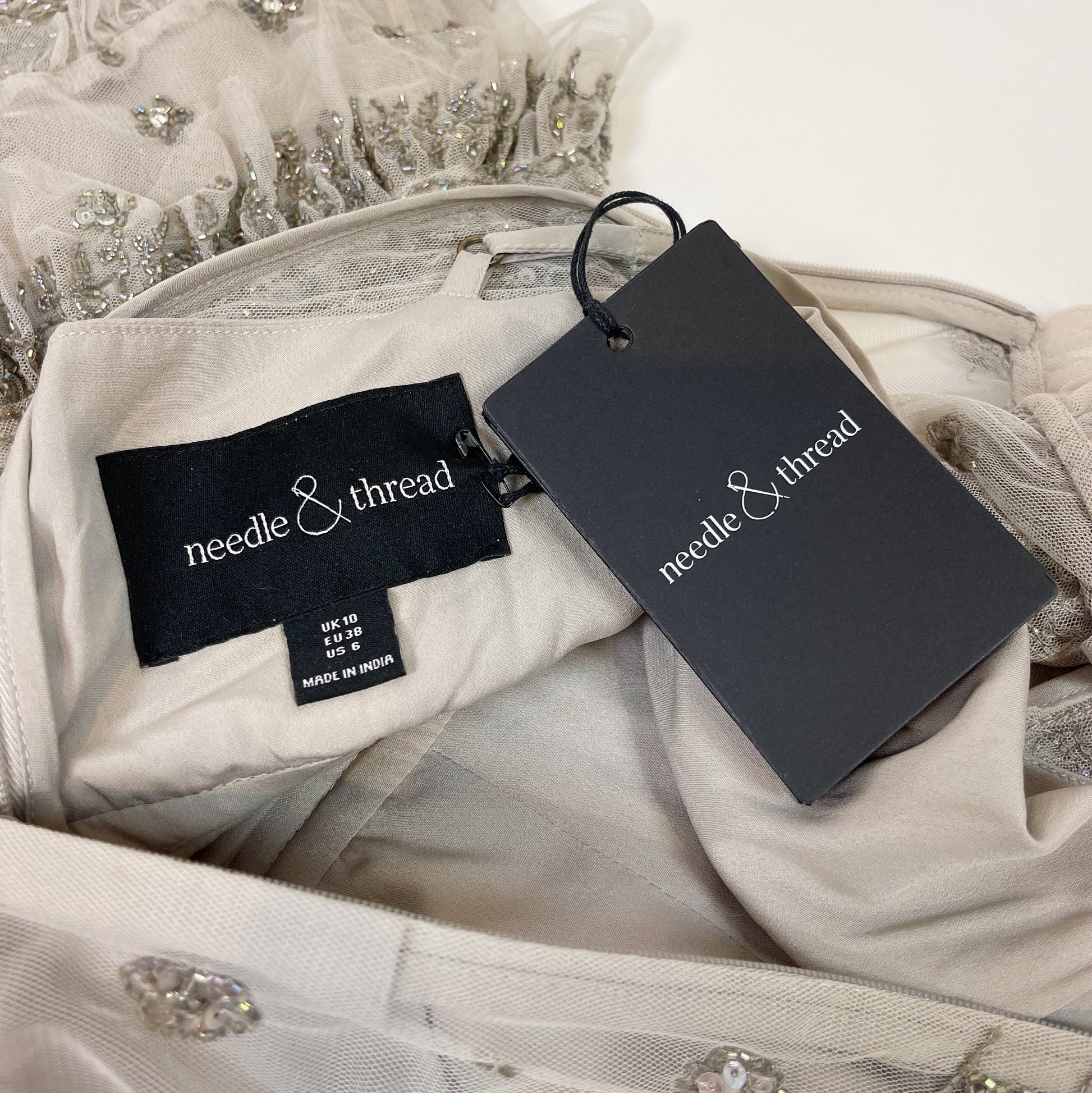 Needle & Thread Beaded Dress featuring delicate beading and embellishments across a ruffled tiered silhouette. Cap sleeves offer a charming, feminine touch perfect for special occasions. The layered design creates movement and dimension, while intricate beadwork adds glamour and sophistication to every wear.