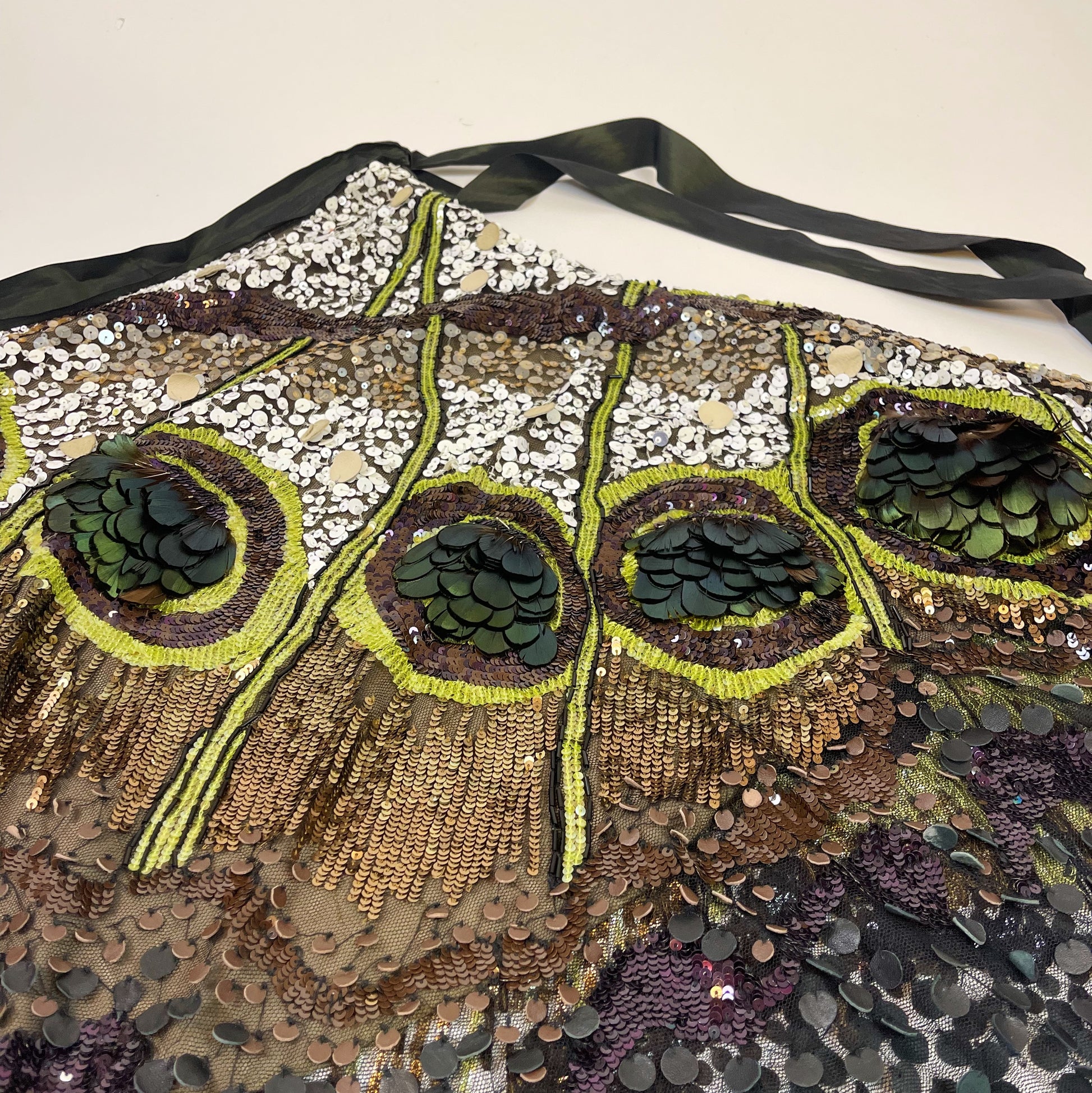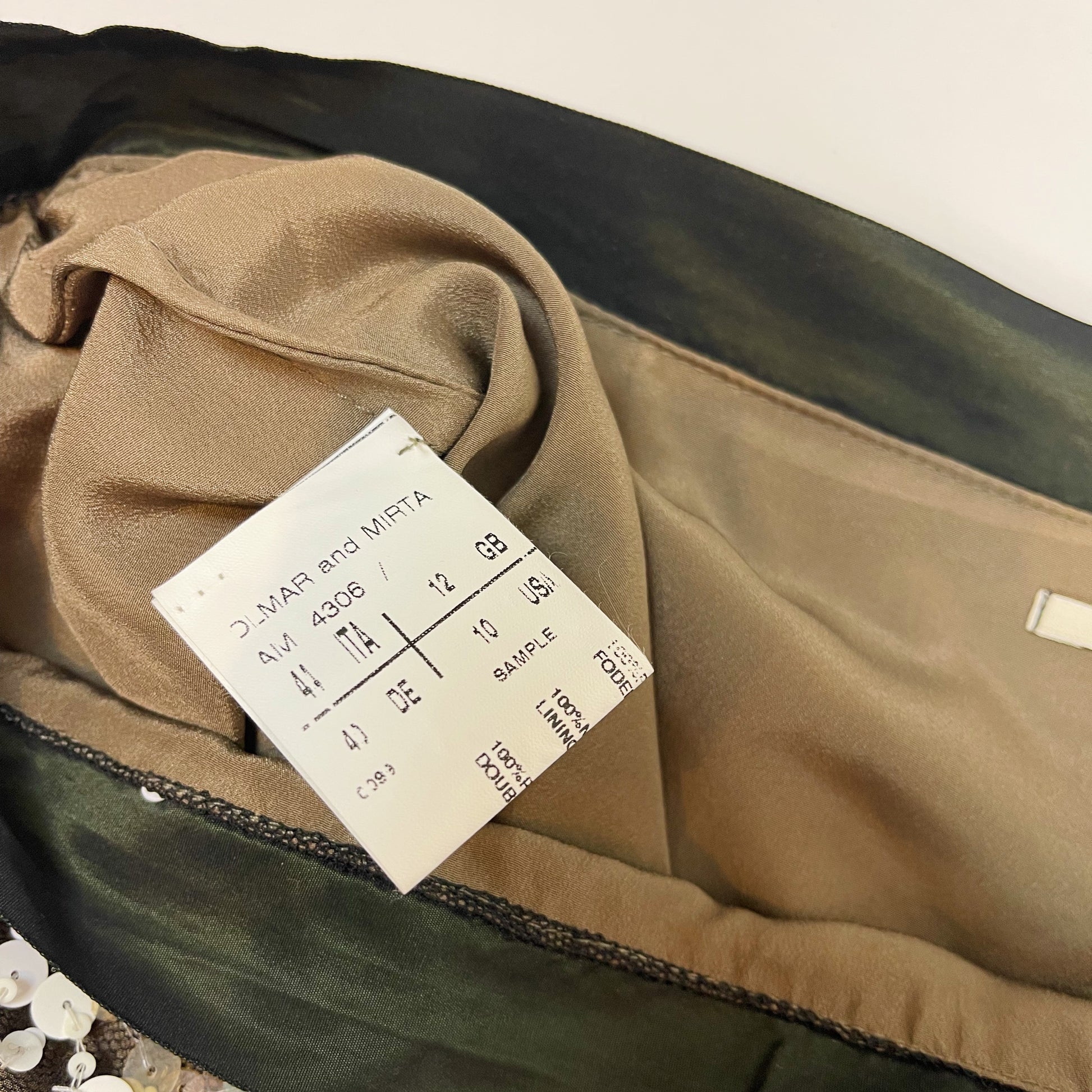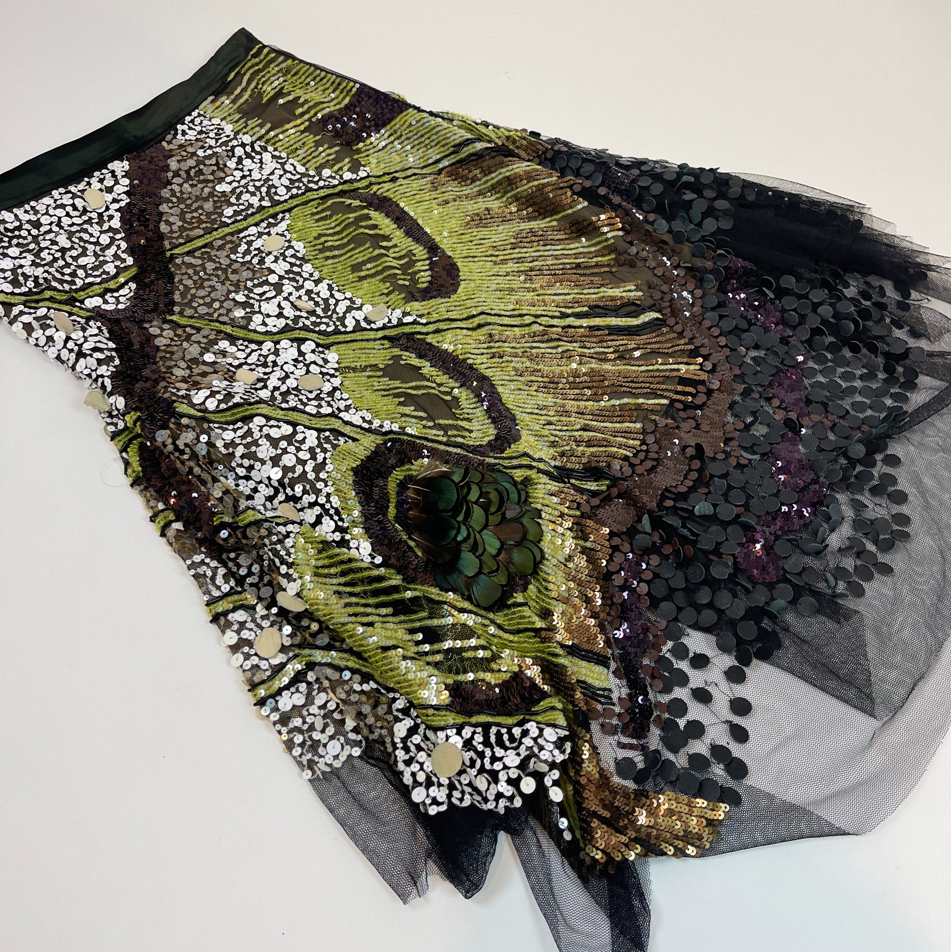 A rare archive piece from Rick Owens featuring intricate peacock-inspired beading work. This unique sample skirt showcases the designer's distinctive craftsmanship and artistic vision. A collector's item for those who appreciate avant-garde fashion and exceptional detail.
