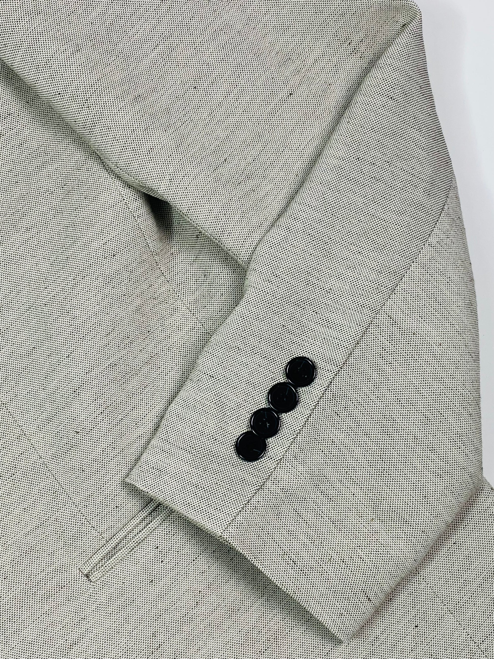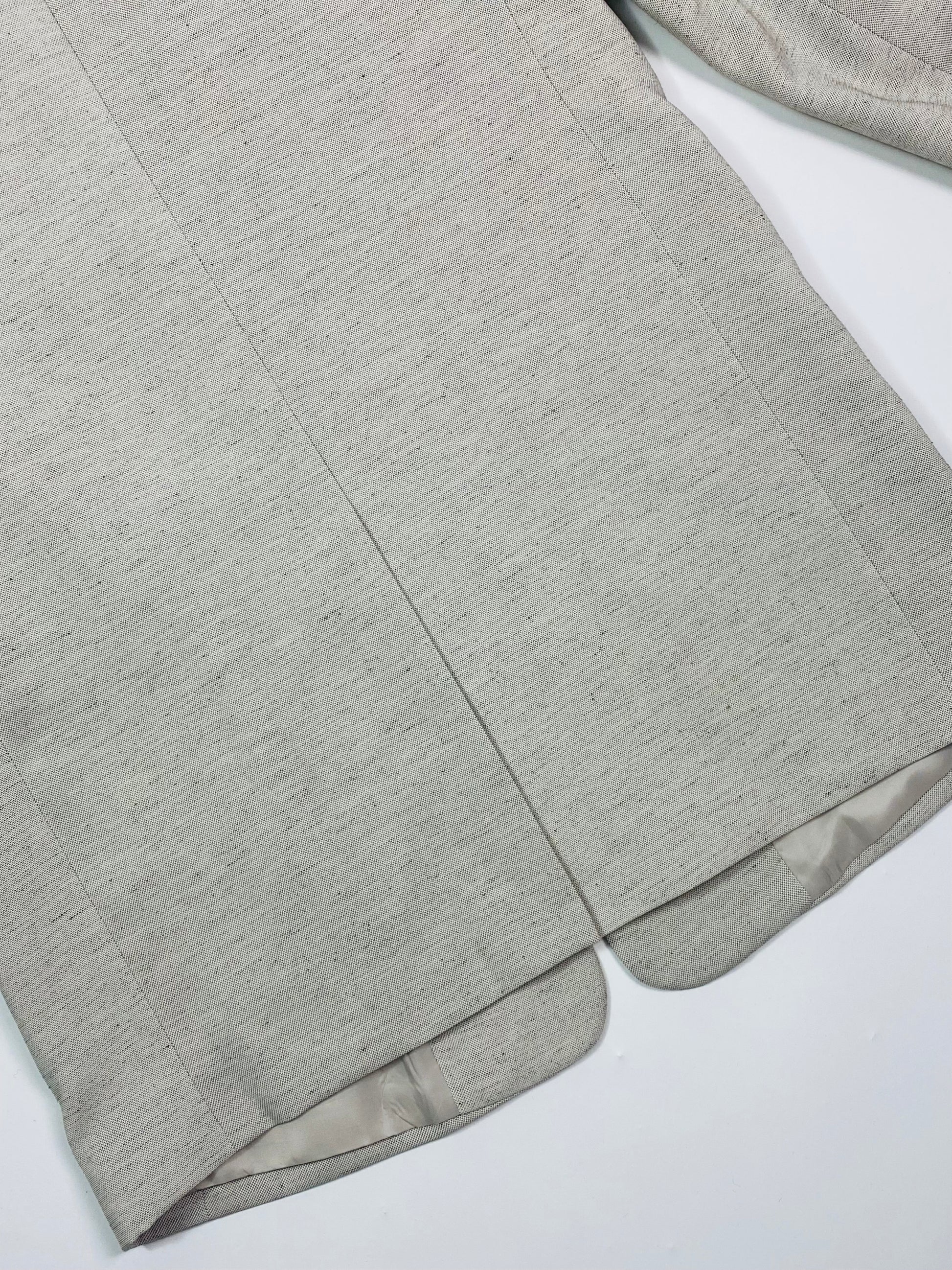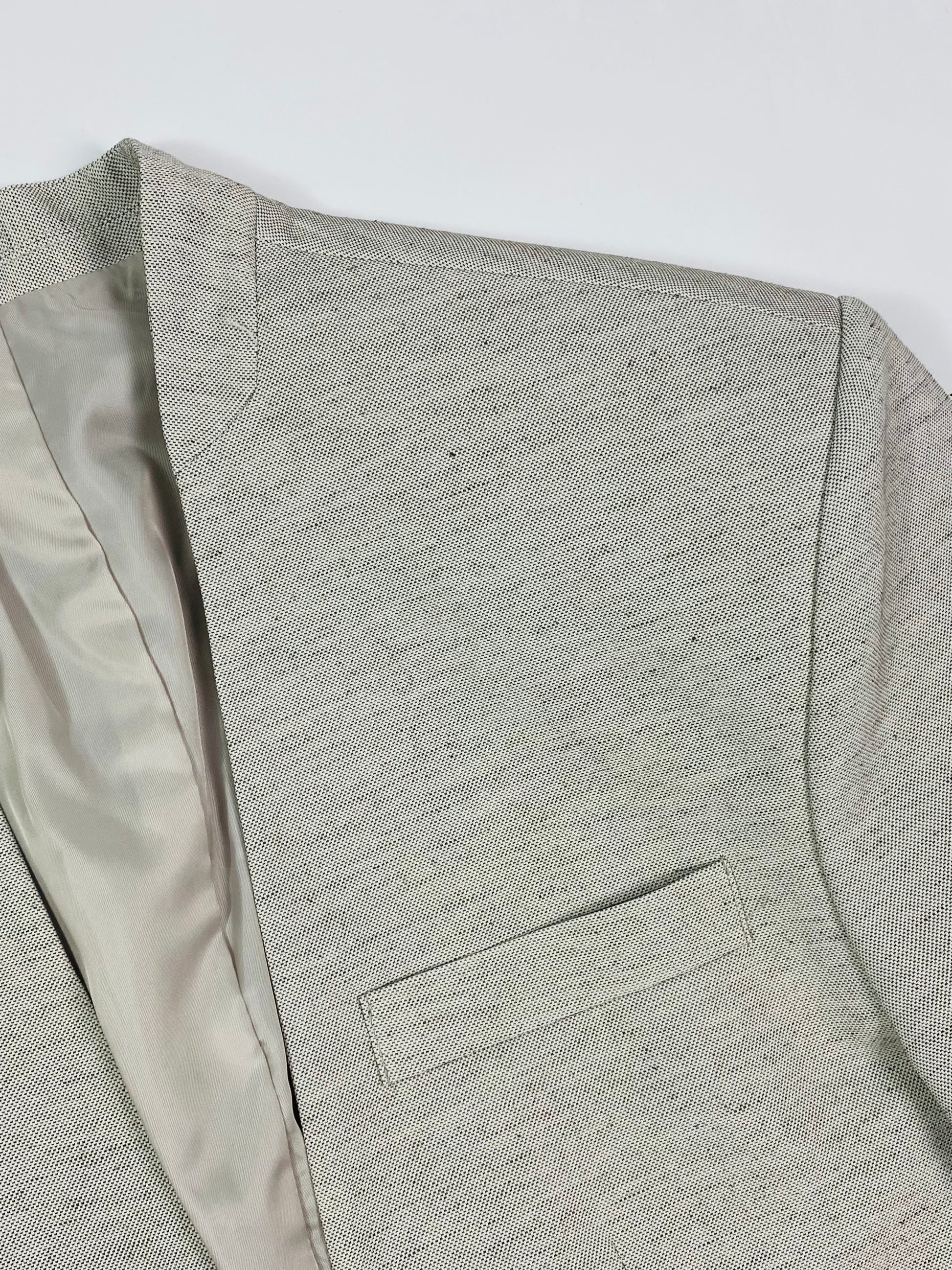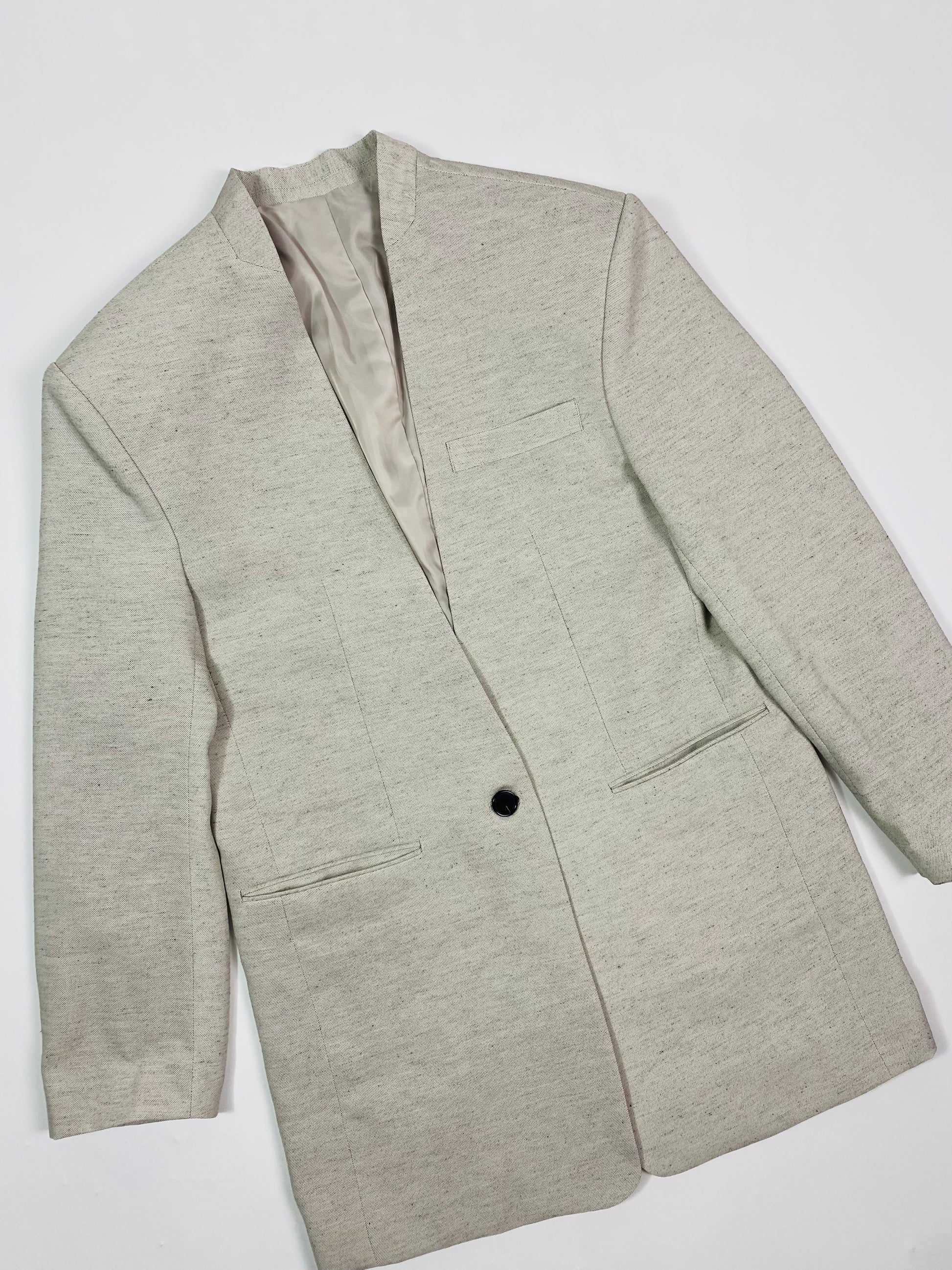Gorgeous collarless single-breasted jacket in a warm grey tone, featuring two welt pockets at the front and a breast pocket. Silk lining on the interior of the jacket and black buttons on the sleeves as well as a single button closure. A classic and sophisticated look with a modern touch.