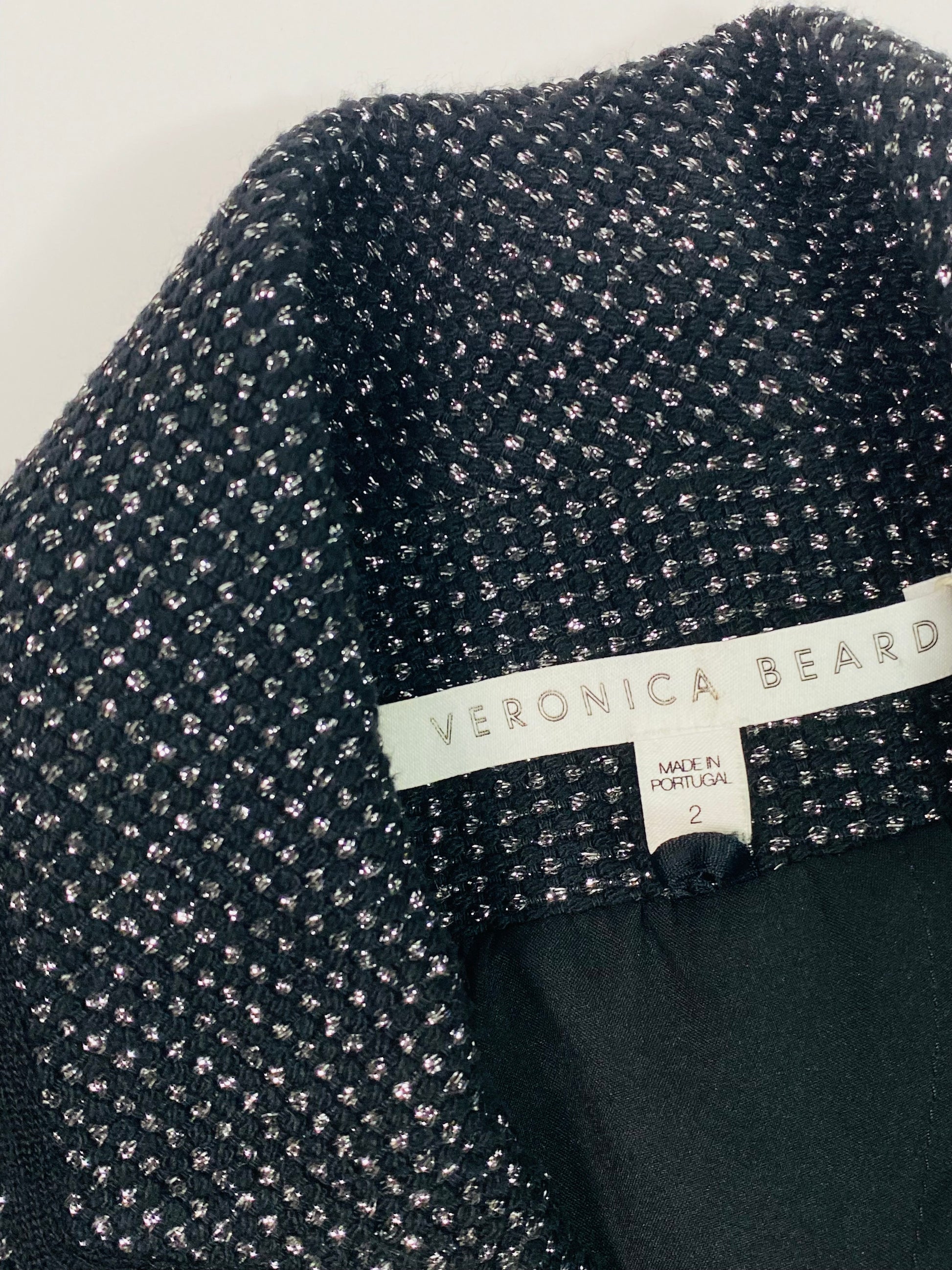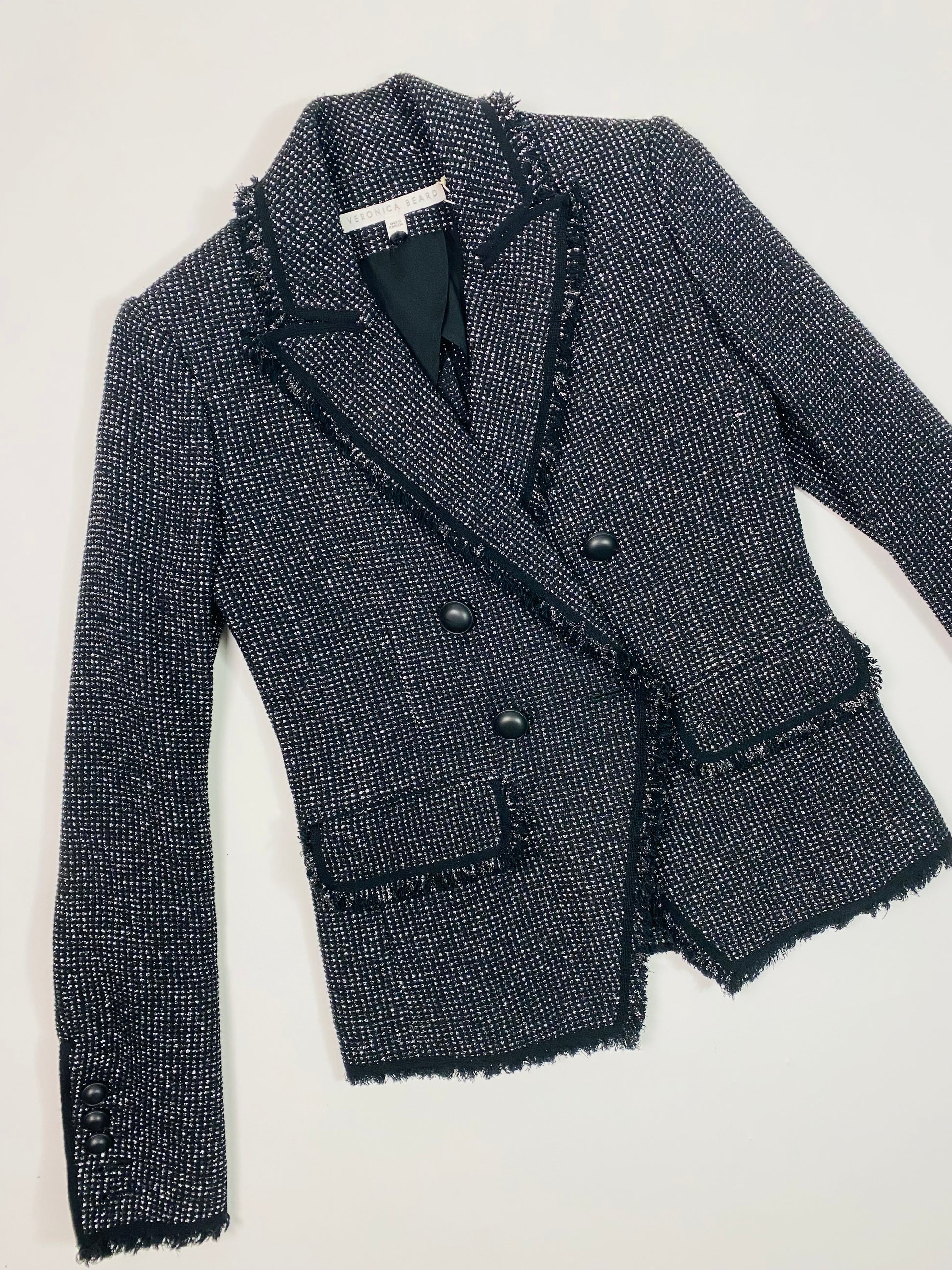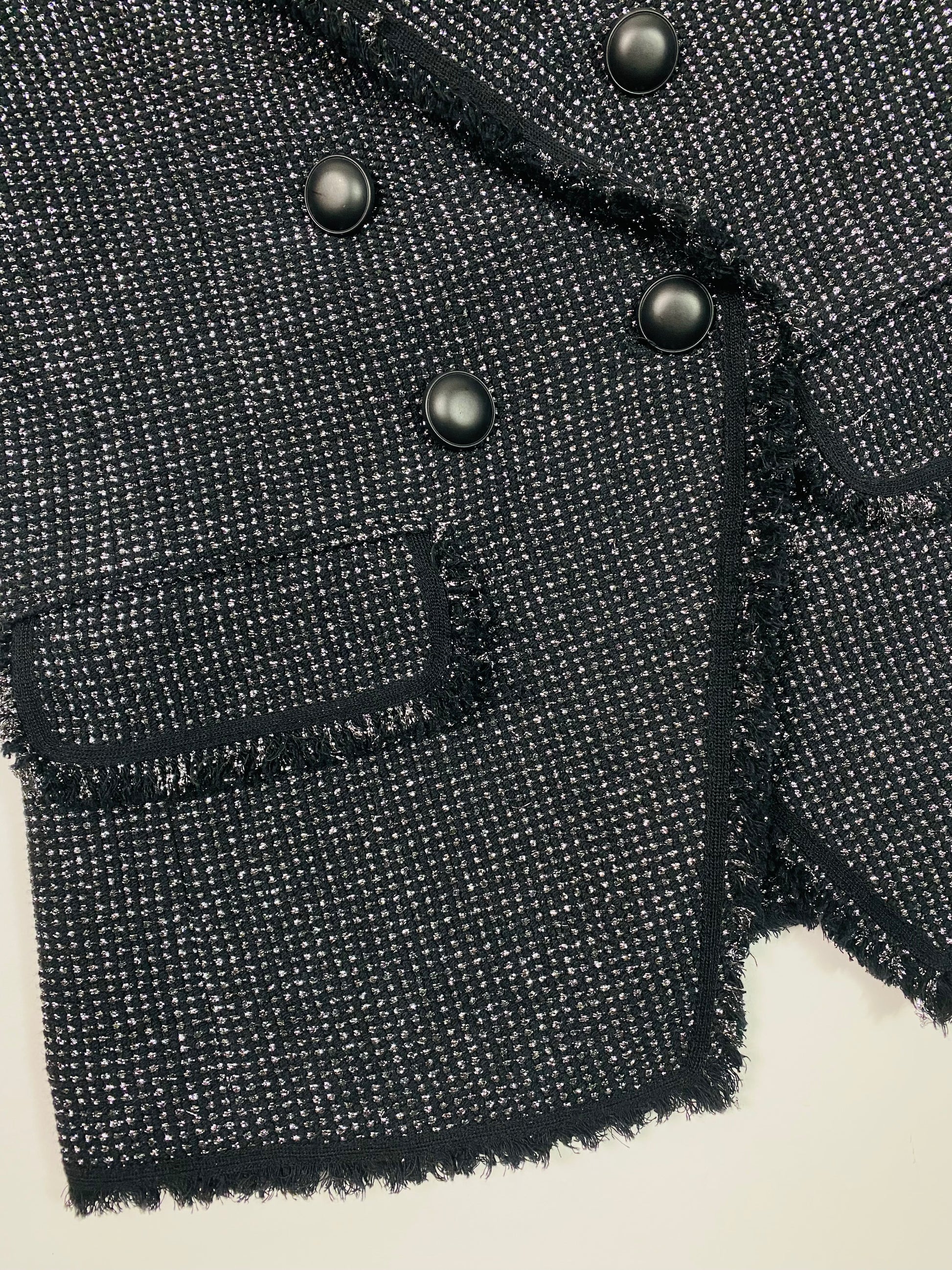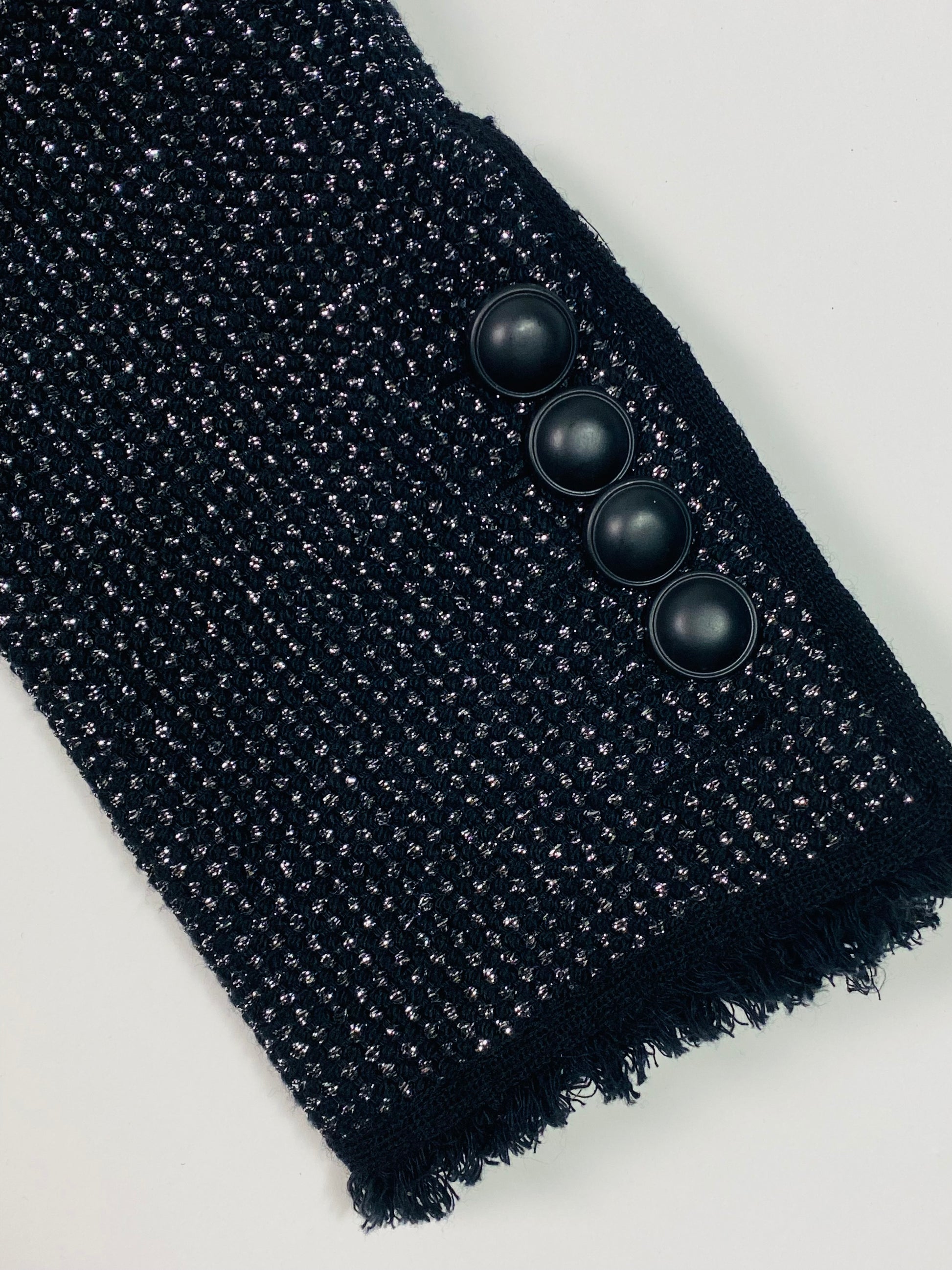 Stunning black sparkly tweed style fitted jacket. Features a double-breasted design with two front pockets and sleek, matte black buttons on the front and sleeves. Fabulous styled both dressed up or down!