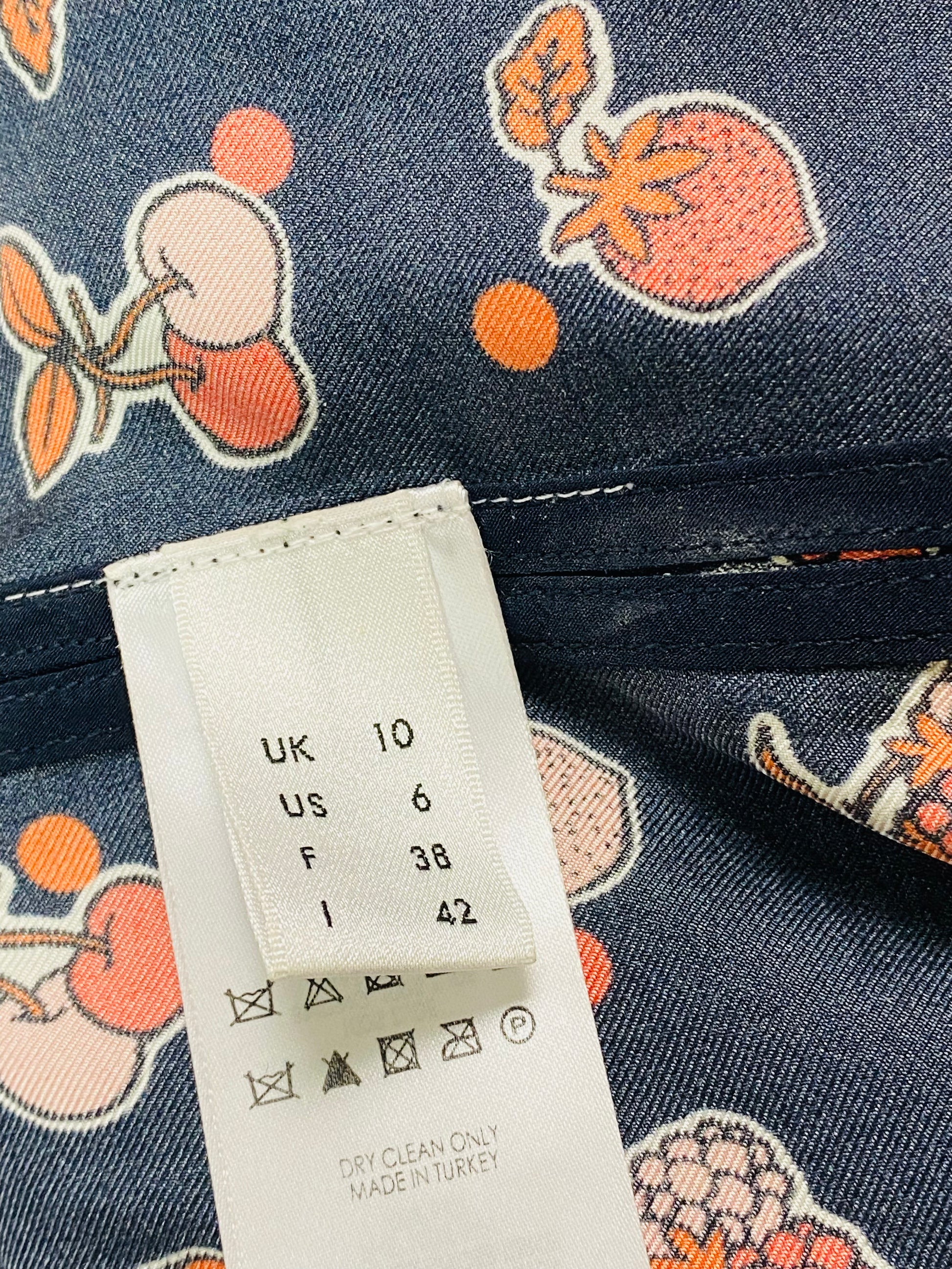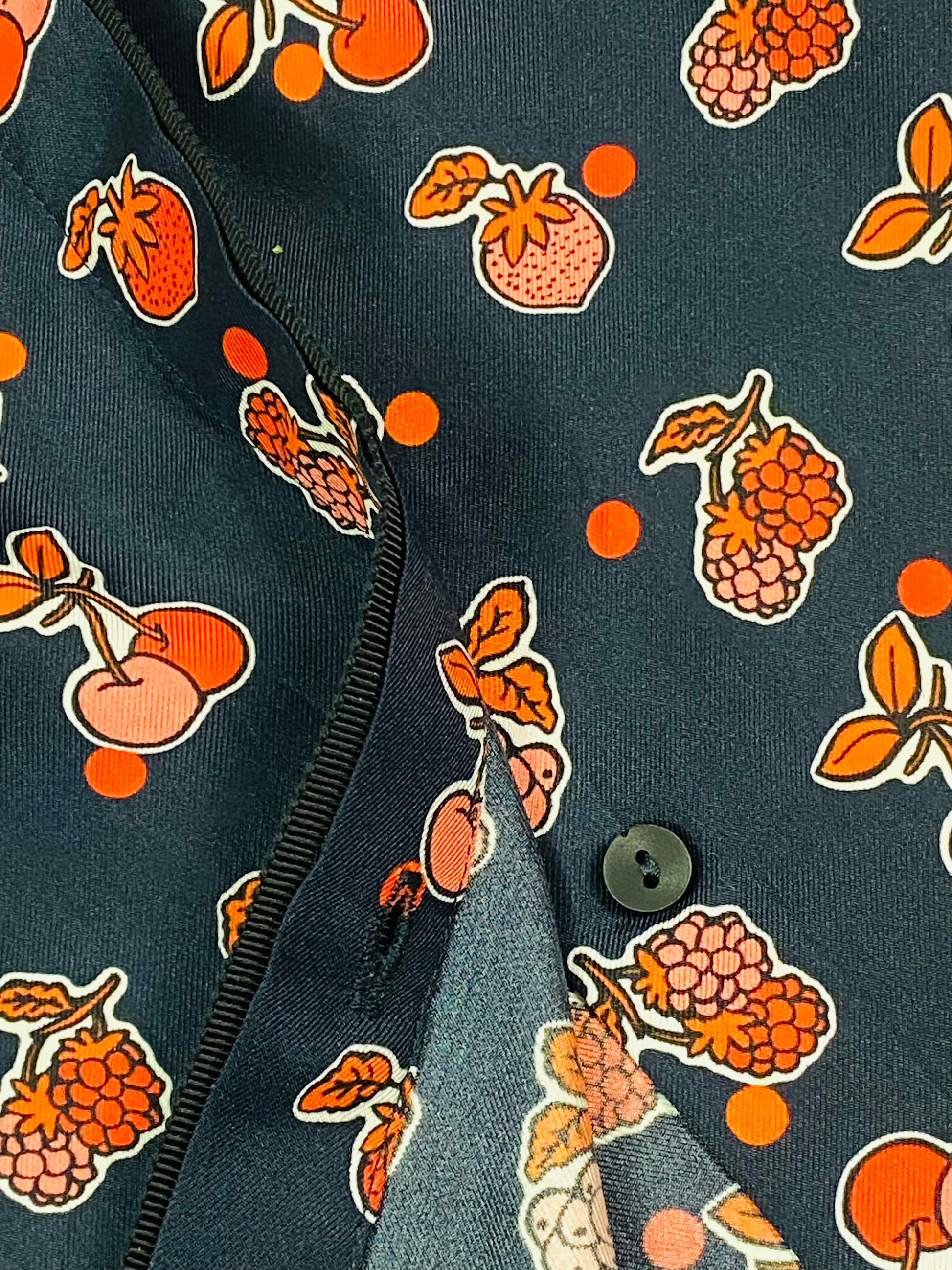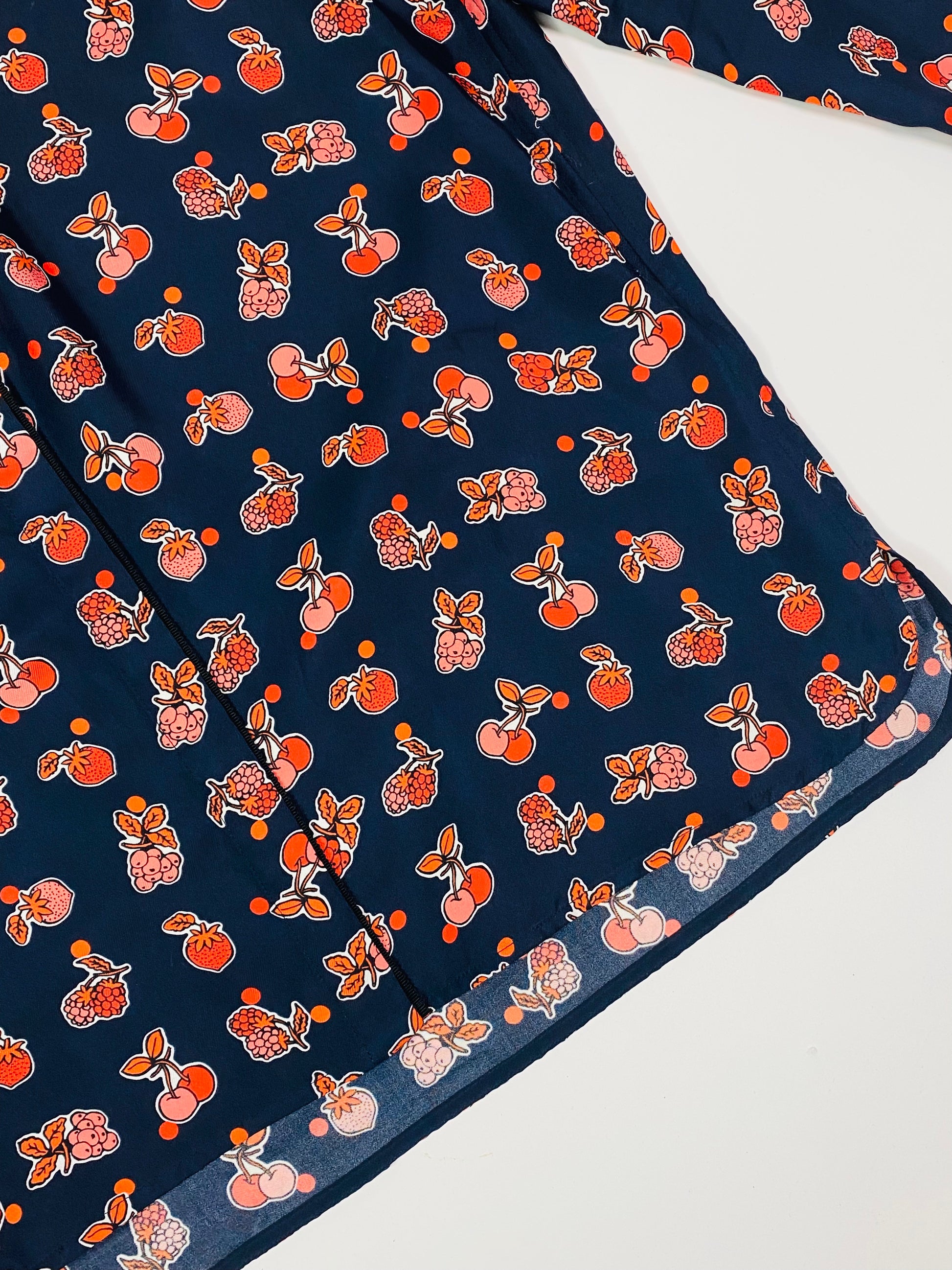 Gorgeous deep navy blue collared shirt featuring extra long and widely cuffed sleeves for an elegant look. Also features a graphic orange and red fruit design patterned throughout the silk fabric. Buttons discreetly line the front of the shirt under a narrow panel of fabric.