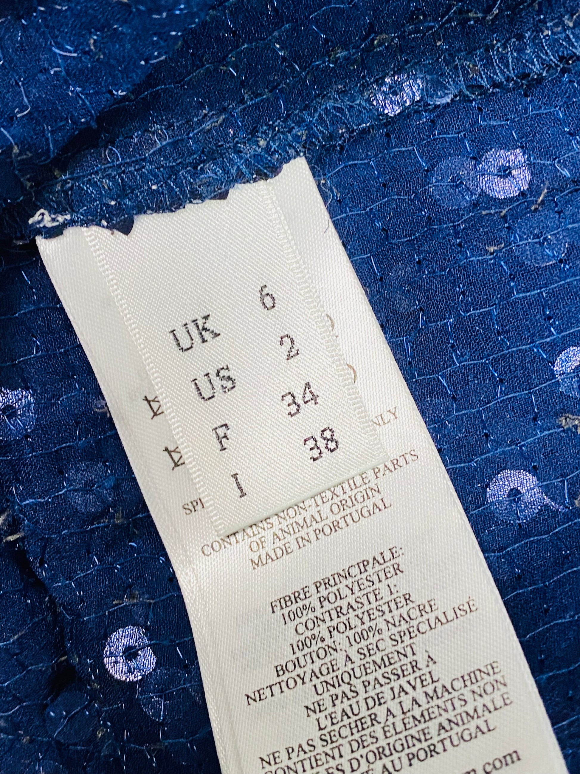 Fabulous navy sequin shirt by VVB, featuring hidden silver pearly buttons down the front and on the wide sleeve cuffs. The perfect piece for your wardrobe coming up to Christmas party season!