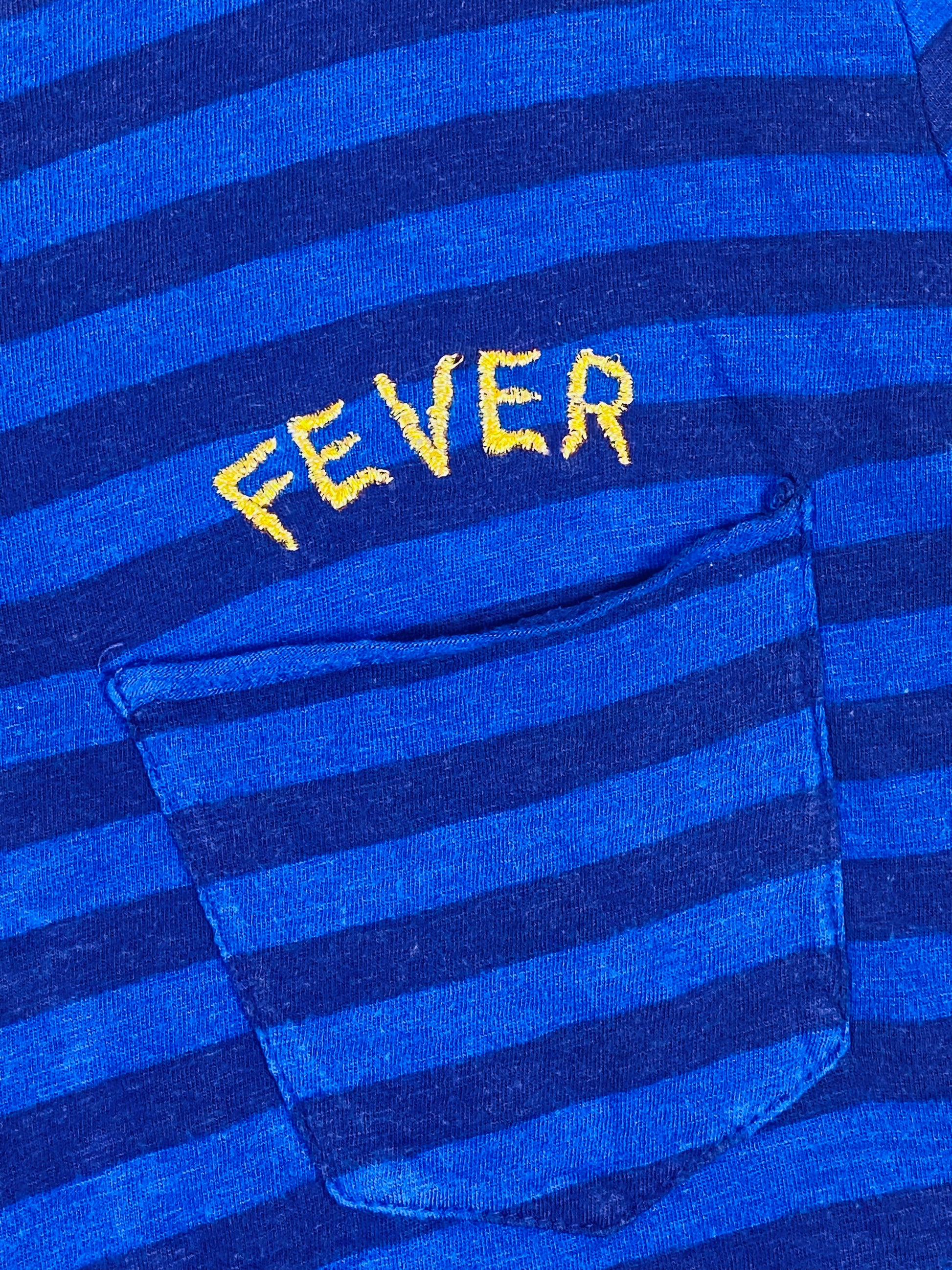 Basic two toned blue striped long sleeve top in a soft cotton mix. Features 'FEVER' lettering in a yellow gold embroidery above the little pocket. Cosy for everyday wear.